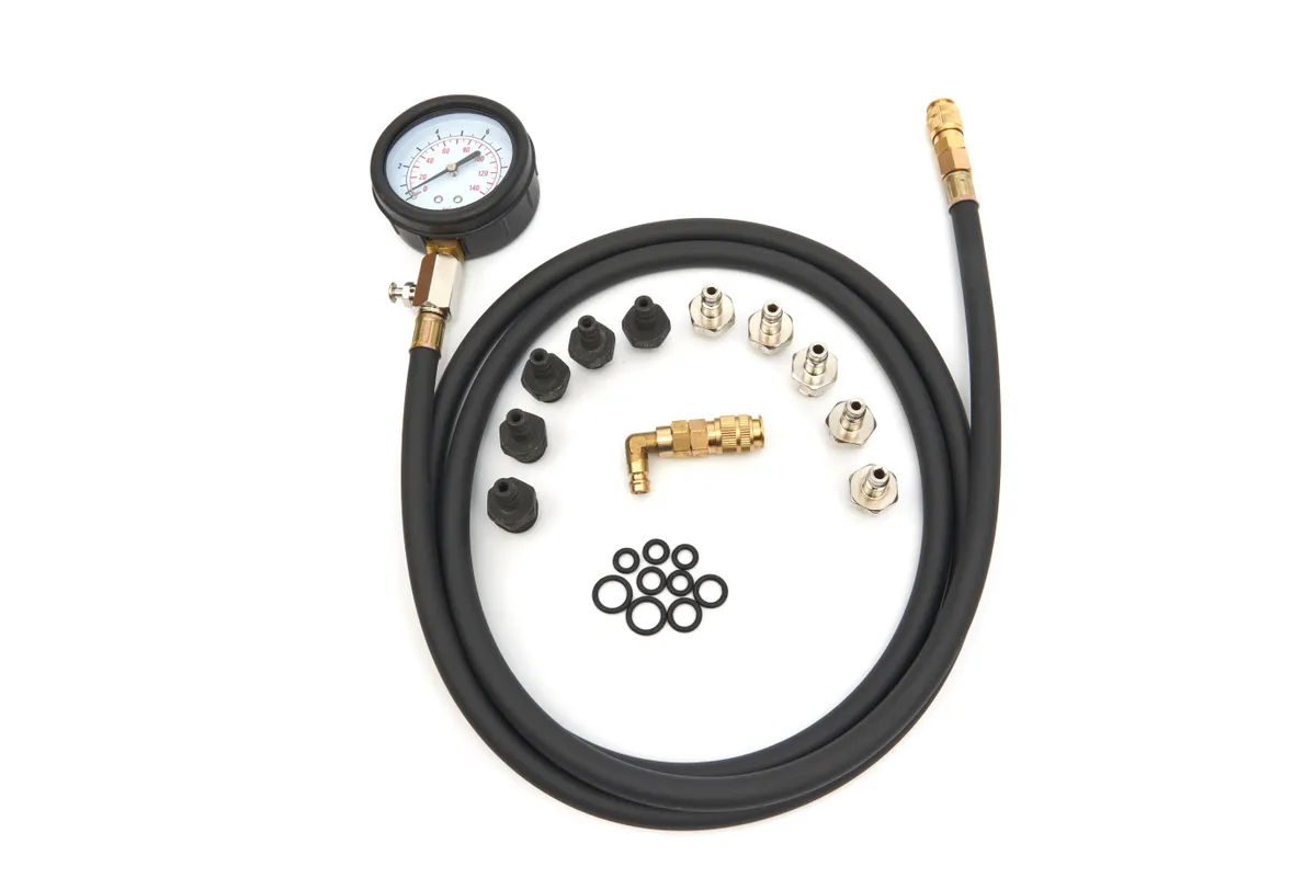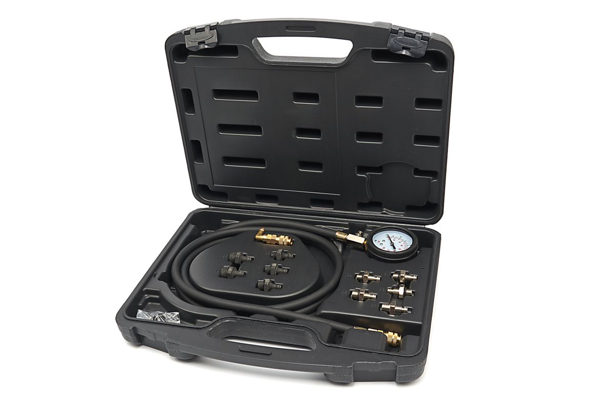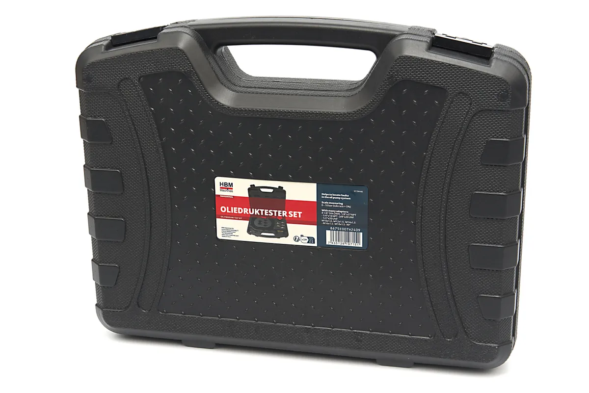 Deze HBM olietester helpt bij het opsporen van storingen in het oliepompsysteem. De schaal meet tot 10 bar met een tolerantie van ±5%. Dankzij de meegeleverde verloopstukken – waaronder metrische en NPT-adapters – is de tester inzetbaar op verschillende voertuigen en toepassingen.