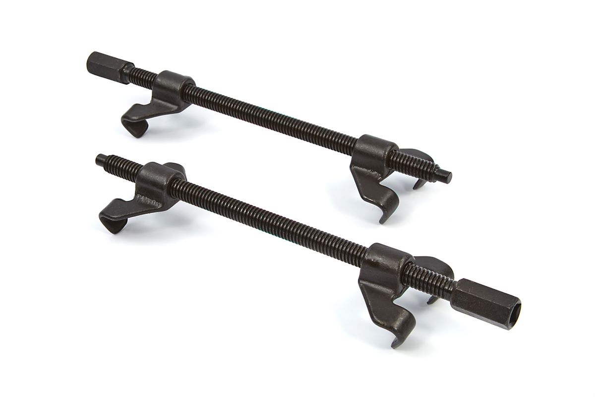 Technische gegevens van de HBM 355 mm. Veerspanner set van 2 stuks. De veerspanners zijn ideaal voor het verlagen van auto’s of het vervangen van veren van voertuigen. De veerspanners, ook wel veerklemmen genoemd, zijn een must voor het veilig monteren en demonteren van veren. Met een spanbereik tot 355 mm is deze veerspanner voor bijna iedere spiraalveer te gebruiken. De veerspanners zijn zowel geschikt voor luchtsleutels, ratels en steekringsleutels met 1/2”. De veerspannerset wordt in een set (2 stuks) geleverd.