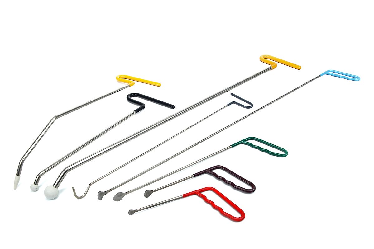 Stangenset voor het uitdrukken van deuken met verschillende vormen en lengten van 200 tot 1.000 mm.