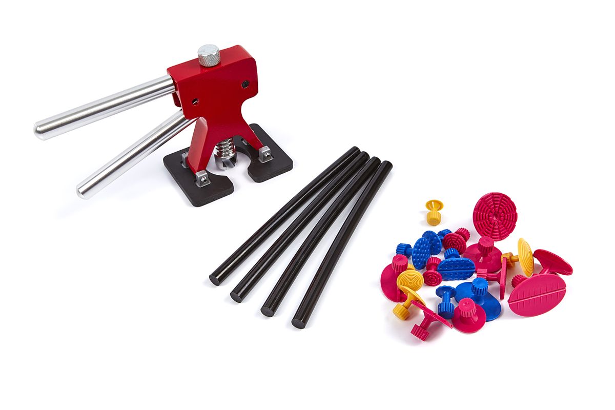 Bespaar tijd en geld met de HBM deukentrekker. Met deze uitdeuk set kan je snel en secuur uitdeuken zonder spuiten. Dit handige stuk gereedschap is vooral geschikt voor het repareren van lichte deuken op vlakke ondergronden zoals van auto’s. Het uitdeuken gebeurt zonder dat de lak wordt beschadigd of kleurverschillen. Je hoeft de auto dus niet over te spuiten. Bij deze uitdeukset worden twintig verschillende pads en speciale lijmsticks meegeleverd. Over de HBM deuken trekker, uitdeuk set, uitdeuken zonder spuiten Elke autobezitter kent de irritaties over kleine deuken in het plaatwerk. Met de uitdeuk set van HBM repareer je deze lichte schades aan je voertuig snel en efficiënt. Het grote voordeel van de deuken trekker is, dat je na reparatie je auto niet opnieuw hoeft over te spuiten. Het uitdeuken gebeurt namelijk zonder dat je de lak beschadigt, of dat er kleurverschillen ontstaan. Bij deze set ontvang je ook nog eens twintig pads in verschillende vormen en maten. Hierdoor kan je zelf bepalen hoe groot het oppervlak moet zijn dat je wilt uitdeuken. Daarnaast zijn vier grote lijmsticks bij de deukentrekkerset inbegrepen.
