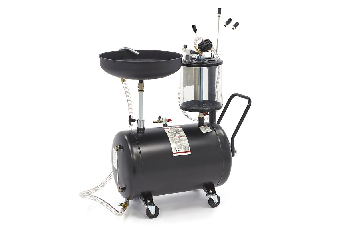 Met de meegeleverde sondes kunt u allerlei motoren via de peilstok ontdoen van olie. Door middel van het grote kijkglas is de hoeveelheid, die u verwijdert uit een motorblok van een camper of boot, eenvoudig af te lezen. Deze olie opvangtank is ook te gebruiken als olie opvangbak.De olieopvangtank is eenvoudig te legen door middel van persluchtaansluiting. Alsmede met de stevige wielset is het apparaat eenvoudig in de werkplaats of garage te verplaatsen en op te bergen. Efficiënt olie verwijderen met deze olieremover. Door middel van vacuum wordt moeiteloos olie verwijdert uit motorblokken (van een auto, tractor, boot), cardan, koelsysteem en meer. Het olie afzuigsysteem heeft een capaciteit van 0,8 tot 1,6 liter per minuut, en de luchtconsumptie is 200 liter per minuut. De olie opvangtank heeft een werkdruk van 0.8 bar en is goed voor een tankinhoud van maximaal 70 liter. Geleverd inclusief verschillende adapters met flexibele slang. Ook deze olie opvangbak wordt geleverd met vier soepellopende wielen waarvan twee zwenkwielen.