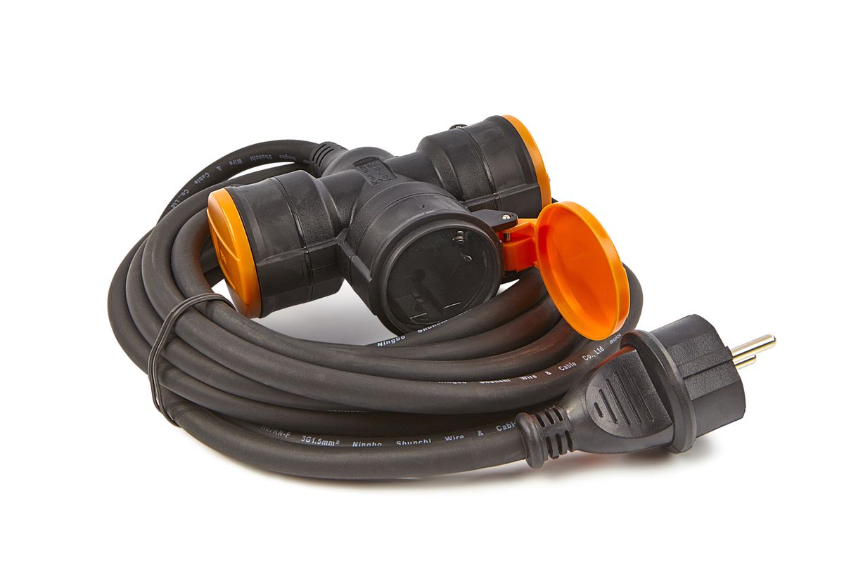Professionele verlengkabel 3-voudig. Max. stroom: 230V ~ 1200 Watt. (opgerold) Max. stroom: 230V ~ 3200 Watt. (afgerold) Snoerlengte: 5 Meter. Kabel: H07RN-F – 3G1.5 mm2. Bescherming: IP44.