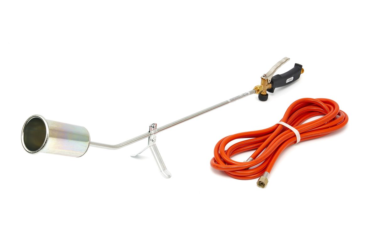 Rothenberger gasbrander met slang. Ideaal om grote gebieden onkruid mee weg te branden maar ook om mee te ontdooien, isoleren, krimpen, drogen of te verwarmen. Ook geschikt als dakbrander of om asfalt te branden. De brandbuis is 600 mm lang en heeft een hoek van 35°. De diameter van de brander is 57 mm. De slang is 5 meter en heeft een G 2×3/8″L aansluiting.