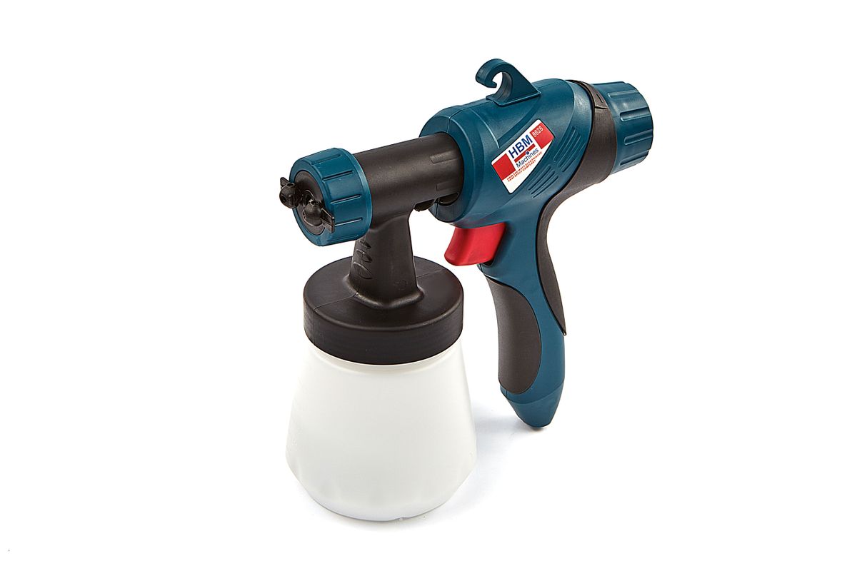 Deze HBM 500 Watt elektrische verfspuit is ideaal voor het verven van kleinere oppervlakten op karwei. De compacte lichtgewicht spuit neem je gemakkelijk mee. Je hebt met deze verfspuit geen persluchtcompressor nodig, dus dat is makkelijk. De 180 cm lange slang zorgt voor voldoende bewegingsvrijheid tijdens het spuiten. De spuit is geschikt voor alle soorten verven met een maximale viscositeit van 50 Din/sec. Over het algemeen gebruik je bij het spuiten minder verf en is de dekking beter. Dat is een goed recept voor een strak resultaat. Over de HBM 500 Watt elektrische verfspuit De basis met elektromotor is voor zien van een stevige handgreep en een praktische berging voor de verfspuit met beker. Zo heb je een compact systeem dat je makkelijk verplaatst. Deze elektrische verfspuit is geschikt voor professioneel gebruik en voor de doe-het-zelver. Sluit deze elektrische verfspuit wel aan met een degelijk verlengsnoer. In de webshop hebben wij ook kabelhaspels met een automatisch oprolmechanisme. Zo voorkom je ongelukken door rondslingerende verlengsnoeren.