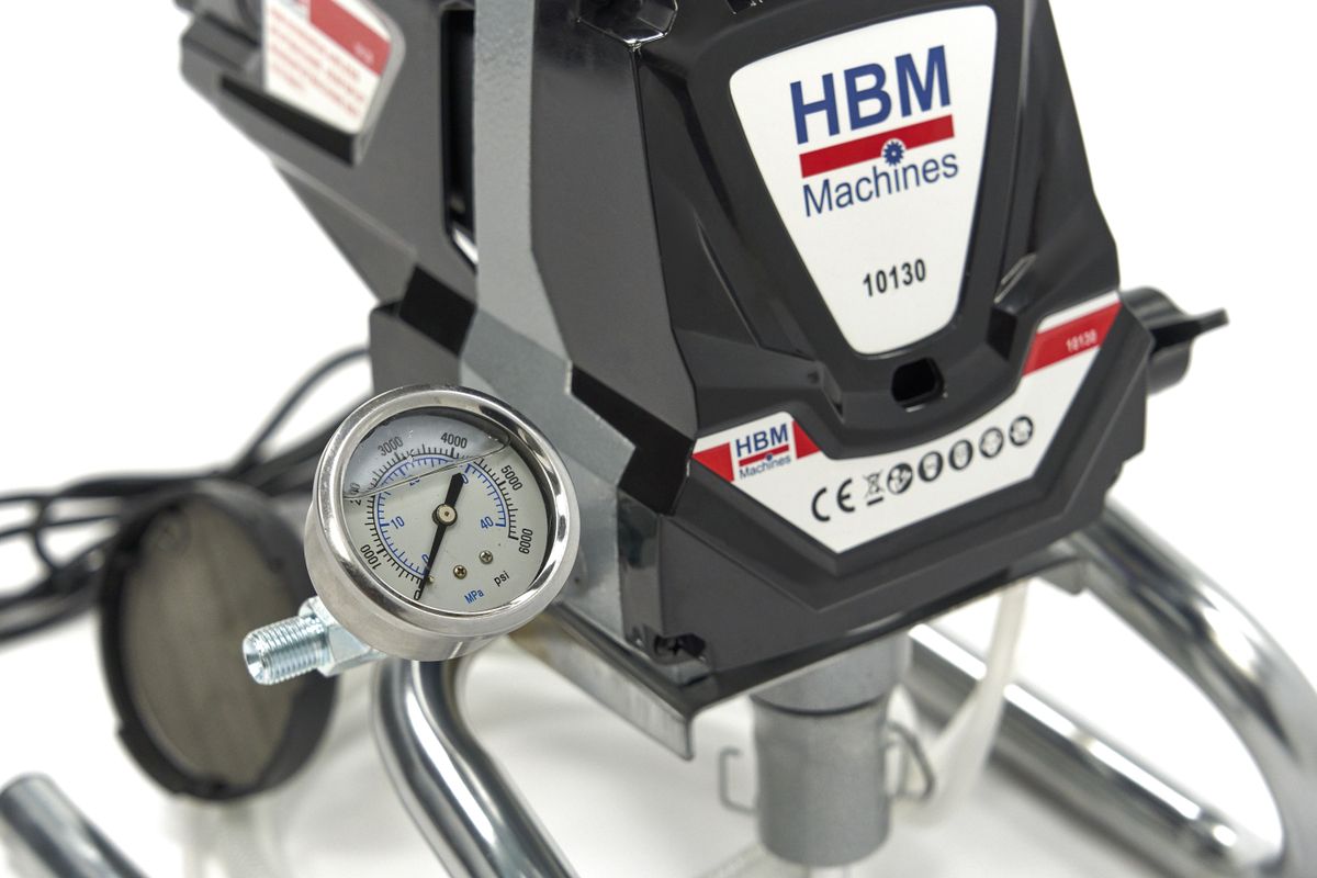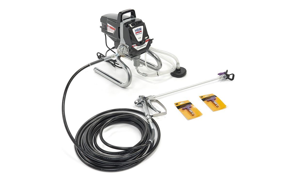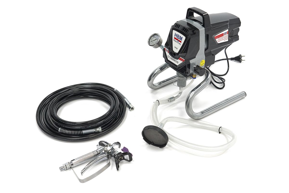HBM Hogedruk Airless Spuitmachine – 1010 Watt is ontworpen om muren snel en egaal te spuiten met verspuitbare muurverf. Via een 10 meter lange hogedrukslang pompt het apparaat verf onder hoge druk naar het spuitpistool. De spuitmond is draaibaar voor horizontaal of verticaal gebruik, en nozzles met verschillende spuitbreedtes zijn eenvoudig te verwisselen. Voor lastig bereikbare plekken kan de nozzle links of rechts gericht worden. Standaard wordt een extra nozzle en een verlengstuk meegeleverd waarmee je grotere oppervlakken in één vloeiende beweging bedekt. De pompunit staat stabiel op een metalen frame en bevat een manometer voor de druk en een omkeerschakelaar om zowel invoer als uitvoer leeg te pompen. Zo blijft er minder verf achter in de slangen. De siliconen aanzuigslang heeft een verzwaarde metalen filterkop die goed op de bodem van de verfemmer blijft liggen. Let op: dit model is niet geschikt voor latex, maar alleen voor speciale verspuitbare muurverf dit staat op emmer aangegeven.