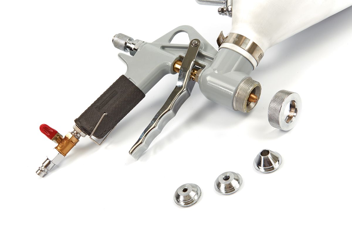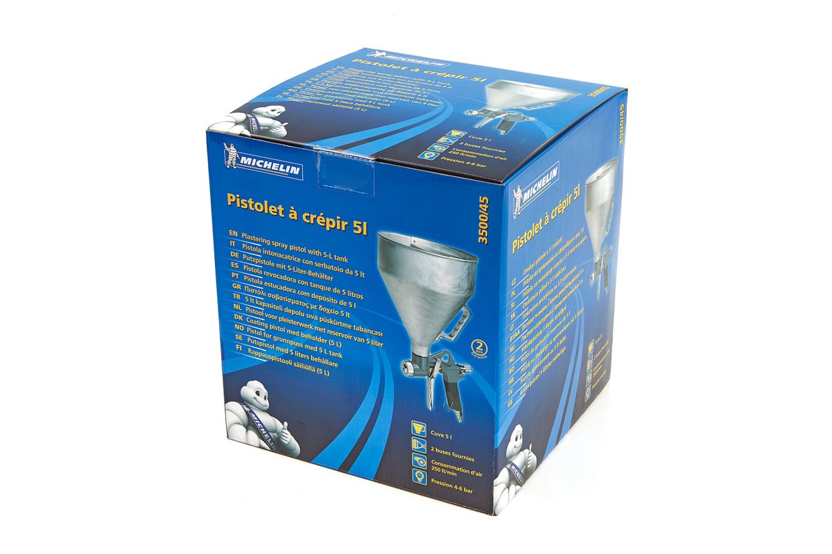 Pleisterkalk pistool met een bovenbeker van 5 liter voor het bewerken van de muren met verf of pleister. Op de luchtinlaat zit een hendel (kogelkraan) om de luchttoevoer af te sluiten. Hoe gaat u te werk? U begint met de voorbereiding van het materiaal: de vloer, kozijnen en stopcontacten afplakken. Als u wilt voegt u een kleur toe aan de pleister. Meng alles goed en doe het in de verfbeker. Vul de beker tot maximaal 5 liter. In de verfbeker gaat zowel vloeibare verf als decoratiepleister met een korrelgrootte tot 1 mm. Stel het apparaat in met de instelknop voor de luchttoevoer en met de stelschroef voor de materiaal hoeveelheid. Spuit de muur met gelijkmatige banen en gelijkmatige afstand tot de muur, voor een perfect resultaat. Tip: Voordat u begint doet u een spuit test met de hoeveelheid materiaal en de afstand tot de muur. Specificaties pistool: Het pistool werk tussen de 4 en 6 bar met een luchtverbruik tussen de 300 en 400 liter per minuut. Wij raden aan om het pistool te gebuiken in combinatie met de compressor Airpress HL 425/50, gezien de compressor genoeg werkdruk genereert en genoeg aanzuigcapaciteit heeft. Het Michelin Spuitpistool Voor Pleister 5 Liter wordt geleverd Inclusief: Drie nozzles (4, 6 en 8 mm), Kogelkraan, Tule 1/4 inwendige draad.