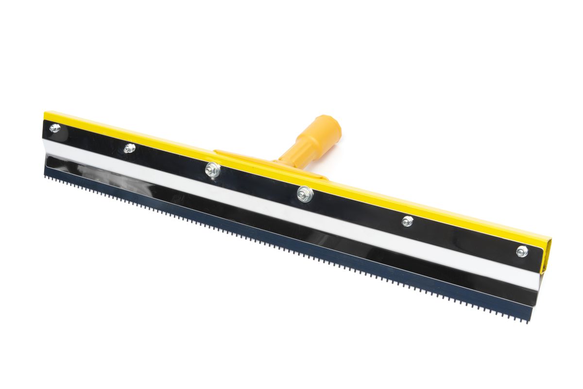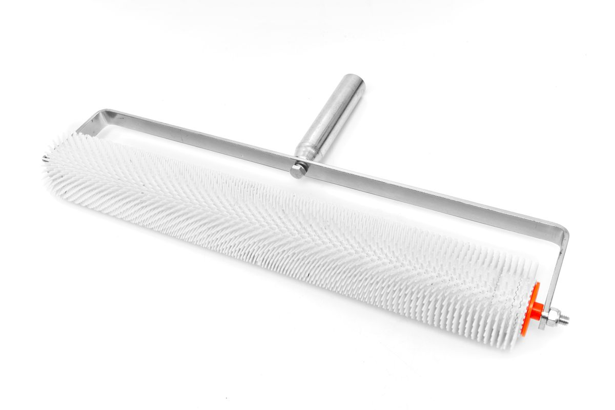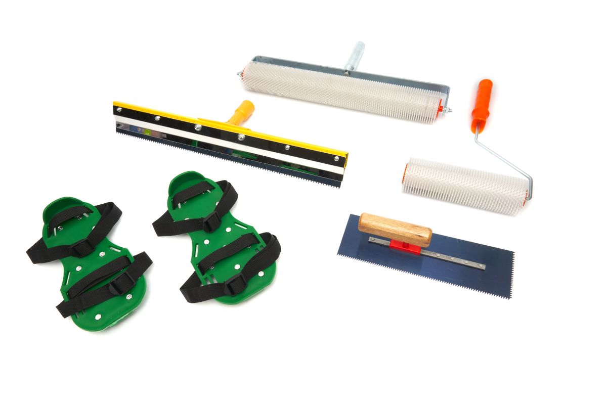 De HBM universele egaliseerset 5-delig is ideaal voor het verwerken van egaline en andere zelfnivellerende producten. Deze set bevat een grote prikroller van 500 mm en een kleine van 250 mm, beide met pinnen van 28 mm voor het efficiënt ontluchten van de vloer. De meegeleverde spike-schoenen (300 x 130 mm) zorgen voor veilig lopen op natte ondergronden. Met de egaliseerhark van 560 mm met 2 soorten harkvormen (3 x 4 mm en 5 x 4 mm) breng je eenvoudig een egale laag aan. Tot slot maakt de lijmschijf van 300 x 110 mm het aanbrengen van lijm moeiteloos.