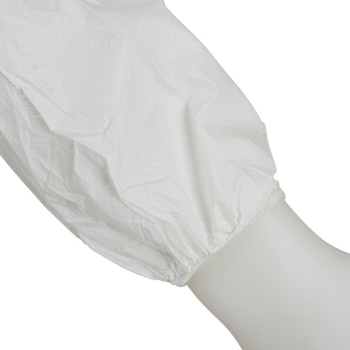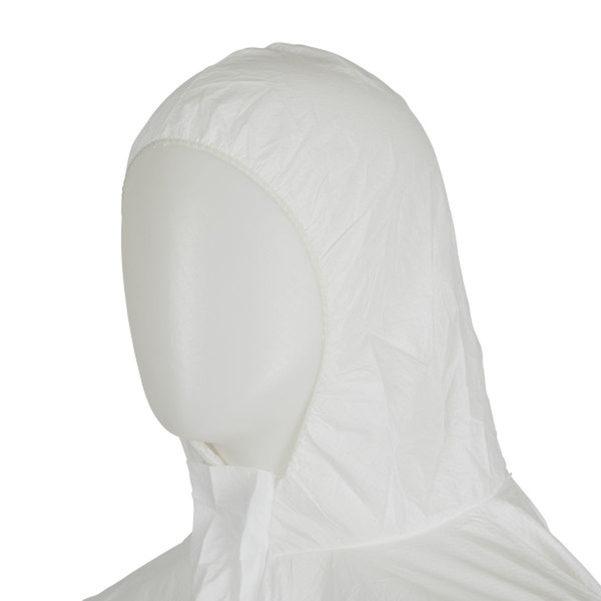De 3M™ Beschermende overall 4510 biedt voordelige bescherming tegen besmettelijke agentia, bepaalde gevaarlijke stoffen en beperkte vloeistofspatten. Ons PE-laminaat bevat microporiën waardoor warmte en vocht uit de huid en via het pak kunnen verdampen, voor een lichte, comfortabele maar beschermende oplossing. Voorzien van een goed dekkende capuchon uit twee panelen en een tweerichtingsrits met stormflap. Elastiek in de taille en mouw- en enkelboorden zorgt voor extra comfort en bedekking die op zijn plek blijft. Het helderwitte materiaal bestaat uit een laag polyethyleenfolie op een zachte nonwoven polypropyleenbasis, pluist nauwelijks en is zeer sterk. De antistatische coating vermindert de statische lading en verkleint het risico op vonkvorming en ontbranding. De overall is licht en zacht, en door de microporiën kan vocht verdampen terwijl het materiaal goede bescherming tegen lichte chemische spatten biedt.