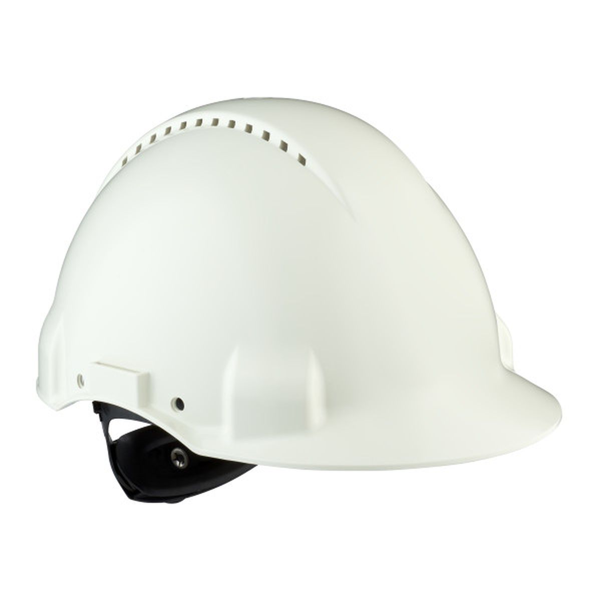 3M™ Veiligheidshelm, G3000NUV-VI is een witte veiligheidshelm met ventilatieopeningen verdeeld over een groot deel en een plastic zweetband voor comfort. De helm is voorzien van ratelverstelling, een vloeiend afgerond ontwerp met een korte klep en 3M™ Uvicator™ sensorschijf die aangeeft wanneer uw veiligheidshelm te veel aan UV-straling is blootgesteld. De witte helm heeft ratelophanging, een plastic zweetband en een vloeiend afgerond ontwerp dat een goed gezichtsveld biedt en helpt voorkomen dat onderdelen aan kabels of takken blijven haken. Ventilatieopeningen verdeeld over een groot deel bieden maximale luchtdoorstroom voor een beter draagcomfort. Een korte klep zorgt voor beter zicht.