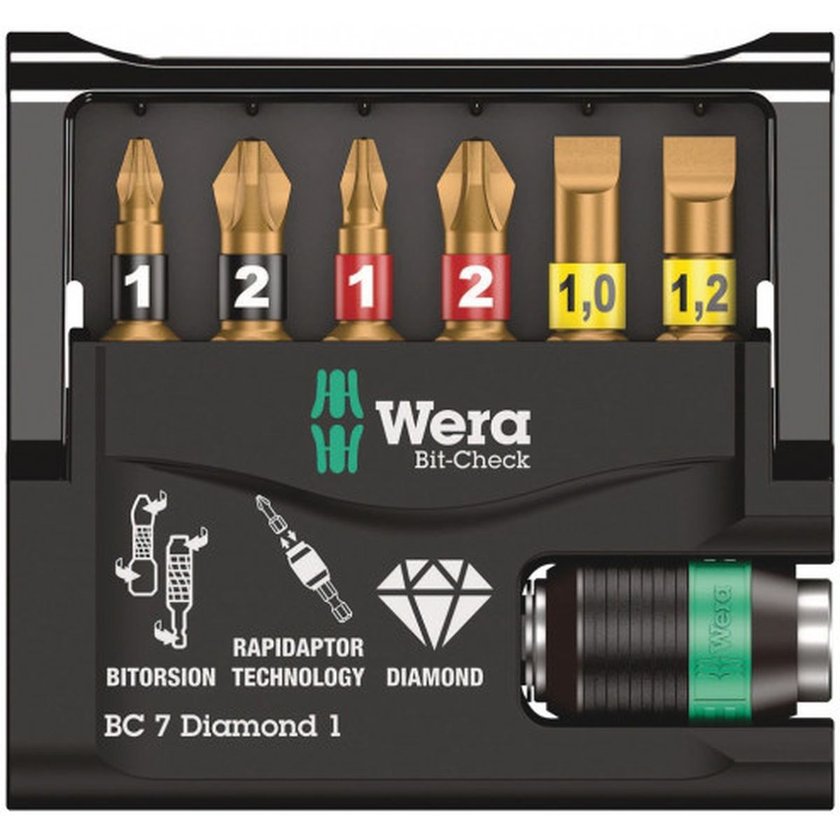 Bits met minuscule diamantdeeltjes op bitpunt. Deze zorgen voor een veilige grip op de schroef, verkleinen de vereiste aandrukkracht en reduceren het risico op wegglijden. BiTorsion-bits met torsiezone, waarin bij belastingspieken kinetische energie wordt afgeleid. Hierdoor wordt de levensduur van het product aanzienlijk hoger. Voorzien van Rapidaptor-technologie, om de bits te kunnen plaatsen zonder daartoe de huls te moeten bedienen. Om de bits weer te verwijderen, hoeft u de huls slechts naar voren te schuiven – zo kunt u bits zelfs met 1 hand razendsnel wisselen. Voor plaatsing in de schroefboormachine of in boorkop van een elektronisch geregelde boormachine. De meerdelige Bit-Check overtuigt door het lage gewicht en uitstekende compactheid. Daarbij zorgt het zachte materiaal in het onderste gedeelte van de Bit-Check voor een betere houvast voor de bits en maakt tegelijk het uitnemen daarvan makkelijker. Het profiel en het formaat van de bits zijn gemakkelijk te herkennen dankzij de Wera ‘Take it easy’-Toolfinder met kleurcodering en duidelijk zichtbare beschrijving.