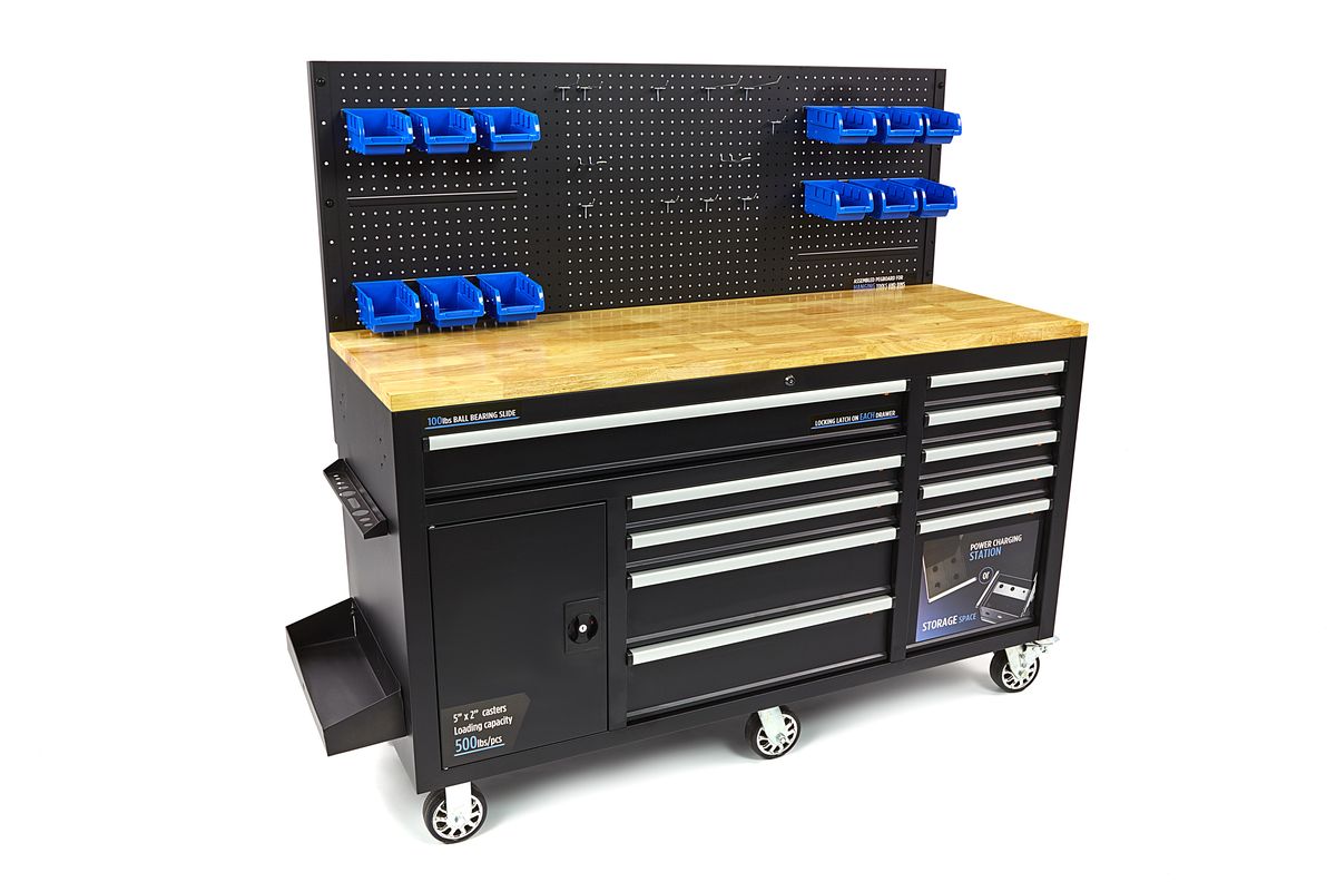 Met de HBM Gereedschapswagen met achterwand en houten werkblad krijg je de perfecte werkpartner voor een georganiseerde en efficiënte werkplaats. Deze robuuste werkbank biedt een overvloed aan opbergruimte voor al je gereedschap, materialen en benodigdheden, ongeacht de omvang van je atelier. Deze werkbank is ontworpen met oog voor organisatie. Met maar liefst twaalf handige opbergbakken kun je je tools en apparatuur netjes ordenen. De grote wielen van 125 x 400 mm maken het verplaatsen van deze werkbank moeiteloos en veilig, zelfs met een gewicht van 125 kg. Hierdoor kun je je werkplek aanpassen aan je behoeften en de werkbank gemakkelijk verplaatsen waar je maar wilt. Een ander kenmerk dat deze werkbank ideaal maakt voor elke werkplaats, is het ergonomisch ontworpen werkblad op een hoogte van 94 centimeter. Hierdoor kun je comfortabel werken zonder dat je rugklachten krijgt. Deze zwarte HBM 158 cm 10-Laden Werkbank met Deur en Achterwand is de perfecte aanvulling op elke werkruimte waar georganiseerde opslag van materialen en een betere structuur en overzicht nodig zijn. Alle laden zijn uitgerust met antislipmatten, waardoor je gereedschap en materialen stevig op hun plaats blijven liggen, zelfs tijdens het verplaatsen van de werkbank. Bovendien biedt de werkbank een massief houten werkblad met een dikte van 3 centimeter, waardoor je gemakkelijk kleinere werkzaamheden kunt uitvoeren. Het open vak en de laden zijn individueel afsluitbaar, waardoor je je gereedschap en spullen veilig kunt opbergen. Elke lade heeft zijn eigen slot, wat extra beveiliging biedt voor je waardevolle gereedschap en materialen.