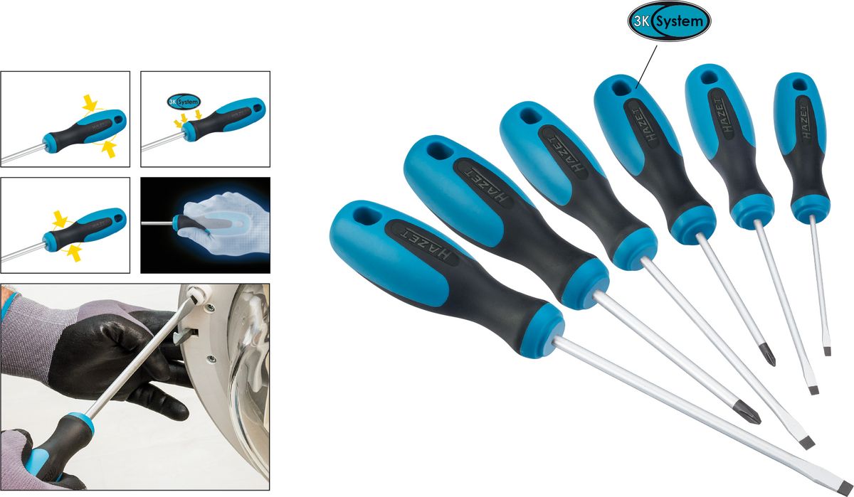 810/6 schroevendraaierset met ergonomische 3-componenten-greep. De 3-componenten greep zorgt voor een hoge krachtoverbrenging, de schroevendraaiers hebben een met vergroomd mes met een geharde zwart gepolijste punt.