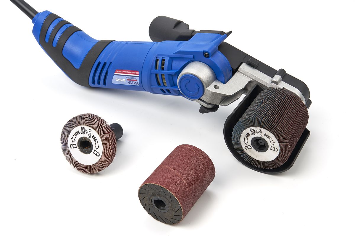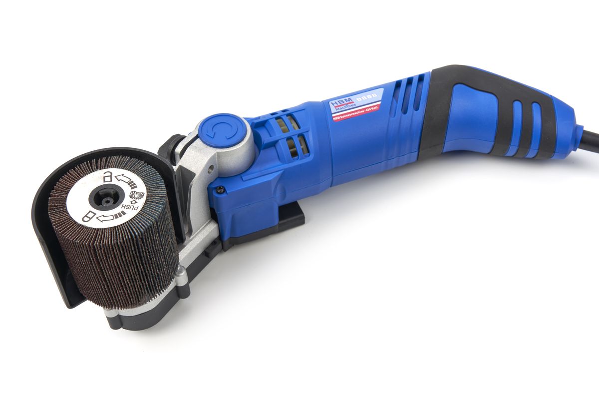 Mooi afgewerkte aluminium of RVS werkstukken hebben vaak een licht geschuurd oppervlak waarin de schuursporen allemaal in 1 richting staan. Dat geeft het werkstuk een chique glans; een afwerking die we kennen van bijvoorbeeld dure audio apparatuur of medische apparatuur. Wie wel eens heeft geprobeerd om dat effect met de hand te bereiken door met een schuurpapiertje over het oppervlak te bewegen, weet dat dit extreem moeilijk is en vaak niet het gewenste resultaat levert. Eén verkeerde beweging met het schuurpapiertje en er staat een kras op het oppervlak in de verkeerde richting die er niet snel meer uit gaat. Dat is waar dit apparaat voor is bedoeld! Voor het fraai opschuren van een metalen oppervlak in één richting. Omdat het oppervlak een satijn achtige glans krijgt van deze bewerking, wordt dit ook wel “satineren” genoemd. Deze HBM borstelmachine (of satineermachine) is voorzien van een kantelbare kop. Door de kop te kantelen kan de ideale positie van de borstel ten opzichte van je hand worden ingesteld. Hierdoor kan je gemakkelijker de machine in één richting heen en weer bewegen en in banen over het oppervlak bewegen. Ook voor het borstelen van moeilijk bereikbare plekken biedt de kantelbare kop een oplossing. De satineermachine wordt standaard geleverd met een 60 mm brede borstel, een 10 mm brede borstel en een 60 mm brede schuurtrommel. De borstels en de schuurtrommel kunnen zeer gemakkelijk zonder speciaal gereedschap op de aandrijfas gemonteerd worden. Het toerental kan traploos worden geregeld tussen 1900 en 400 toeren per minuut. Verder wordt een 32mm stofzuiger verloopstuk meegeleverd. De borstelmachine ligt zeer prettig in de hand dankzij de slanke ergonomische vormgeving. Met deze satineermachine geef je metalen werkstukken een professionele uitstraling en glans.