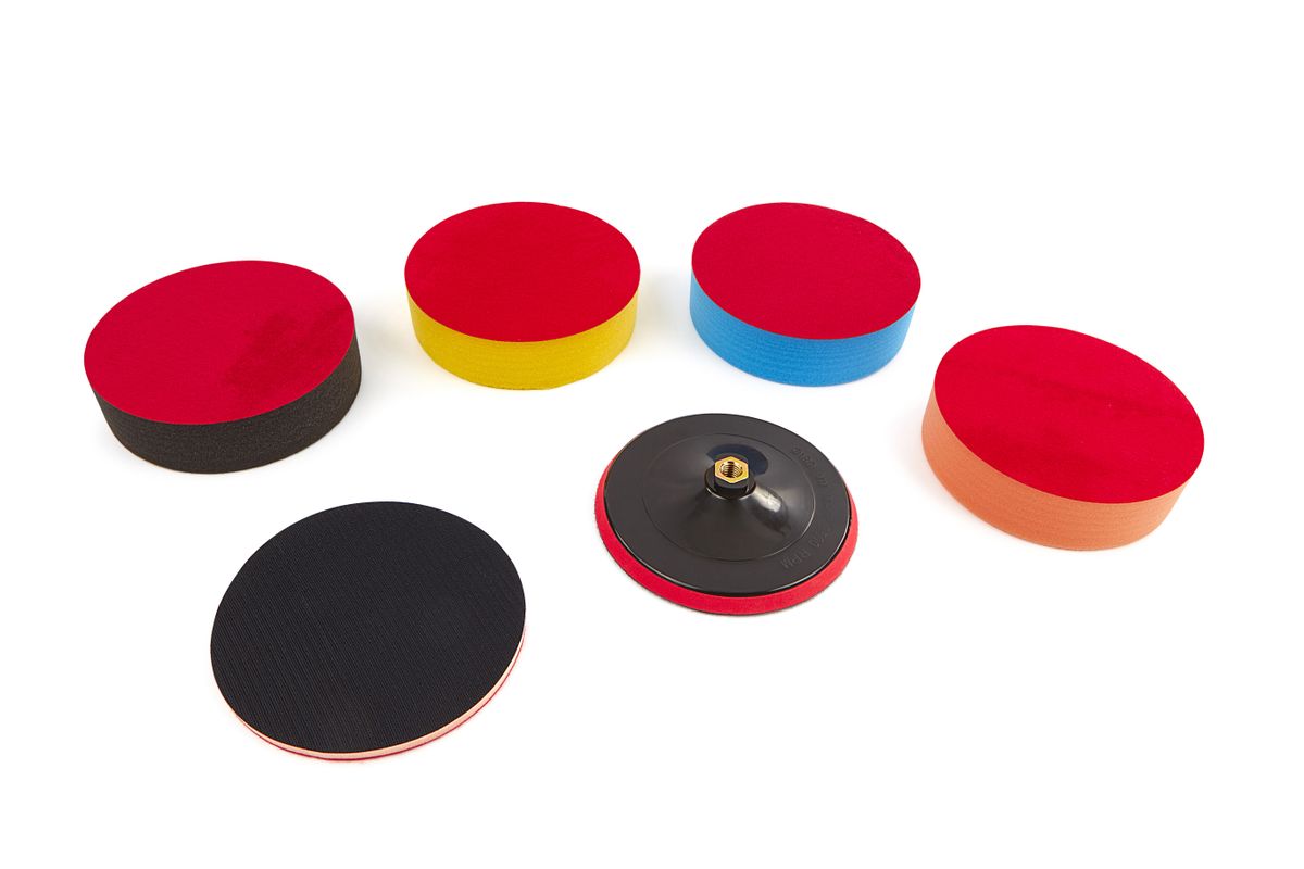 HBM 6 Delige 150 mm Polijstset met M14 Opname. Hoogwaardige, polyurethaan sponzen in zwart, geel, wit, rood en blauw. Voor snijden, polijsten en de laatste afwerkfase. Compatibel met polijst-/slijpmachines met M14 x 2 mannelijke koppeling. Inclusief 1 x M14 x 2 klittenband steunschijf.