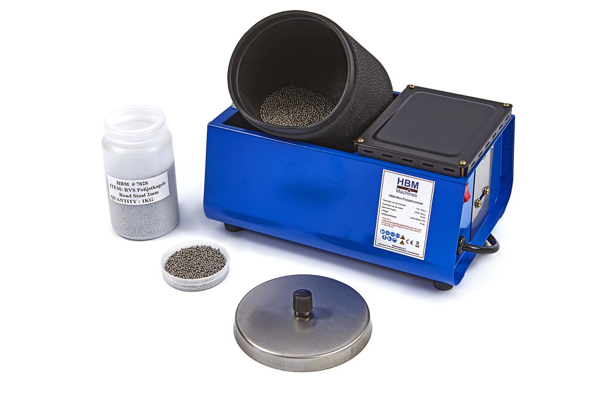 Reinigen der Kugeln: Neue Kugeln zunächst in Ammoniak entfetten und unter Zugabe von Polierseife, jedoch ohne Artikel, ca. 2 Stunden lang schleudern lassen. Flüssigkeitsspiegel ca. 1 cm über der Füllung, auch in Drehstellung. UNTER FLIEßENDEM WASSER GUT ABSPÜLEN. Trommelpolieren: Die Trommel zur Hälfte mit Polierkugeln (oder einem Sortiment) füllen und maximal bis zu drei Viertel des Inhalts mit Gegenständen auffüllen. Wasser bis 1 cm über die Füllung zugeben, ebenfalls in der Wendestellung. Polierseife hinzufügen. Die durchschnittliche Trommelzeit beträgt je nach gewünschtem Ergebnis ca. 5 Stunden. Spülen Sie die Kugeln nach Gebrauch gut aus und lagern Sie sie unter Zugabe von Polierseife unter Wasser. Wenn Sie die Poliertrommel längere Zeit nicht benutzen, empfiehlt es sich, die Kugeln gründlich auszuspülen und gründlich zu trocknen.