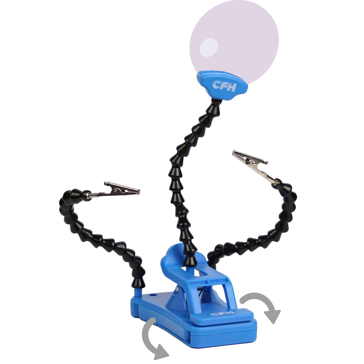 Deze soldeerassistent is de onmisbare “derde hand” bij soldeerklussen. Voorzien van 2 armen met klem welke in alle richtingen instelbaar is.De loep is ook in alle richtingen instelbaar en heeft 2 vergrotingsmogelijkheden, 2,5 en 5 x de oorspronkelijke grootte. Extra stabilliteit wordt verkregen door de uitklapbare voeten.