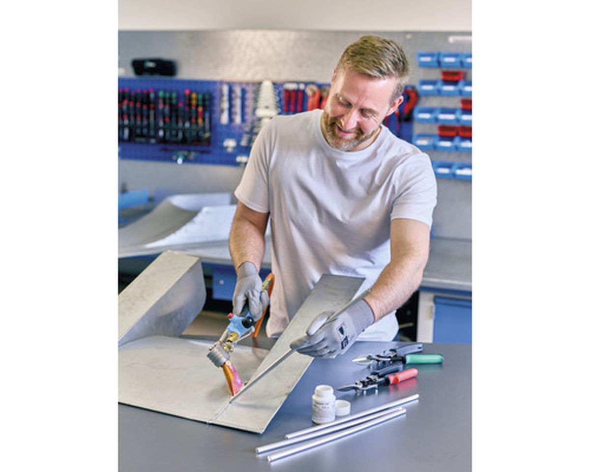 Met deze professionele gassoldeerbout soldeert u moeiteloos verbindingen aan dakgoten en dun plaatmateriaal van bijvoorbeeld koper. Deze gassoldeerbout heeft een maximale werktemperatuur van 730 °C, is voorzien van een Piezo ontsteking, ergonomische 2K greep en aflegstandaard. Door de draaibare gasslangaansluiting van 3/8″ heeft u dus geen last van een opkrullende slang.
