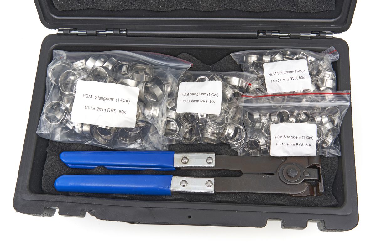 Een uitgebreide set van 200 slangenklemmen met een tang. Hiermee zet je bijna alle soorten slangen binnen en buiten vast. De klemmetjes hebben een hoge sterkte, lange levensduur en houden je slang perfect vast. Inclusief 200 slangenklemmen in vier verschillende diameters, een goede slangenklemtang en een stevige koffer om alles in mee te nemen naar je werklocatie. Over de HBM 202 Delige Slangenklem Assortiment Inclusief Slangenklem Tang Voor 1-Oor Slangklemmen Dit is een hele ruime verzameling slangenklemmen om verschillende soorten slangen stevig vast te zetten. Ze zijn gemaakt van stevig roestvrij staal, waardoor de slangen niet makkelijk los kunnen schieten. Gebruik deze praktische klemmetjes om toiletslangen, gasslangen, waterslangen en afvoerslangen muurvast te bevestigen. Ze roesten niet snel en zijn daardoor ook geschikt voor gebruik buiten en in vochtige omgevingen, bijvoorbeeld op de boot, op kampeerartikelen en in de tuin. Je zet de klemmetjes met behulp van de slangklemtang net zo makkelijk vast als een tie-rip, en met 200 exemplaren in vier verschillende maten kan je jarenlang vooruit.