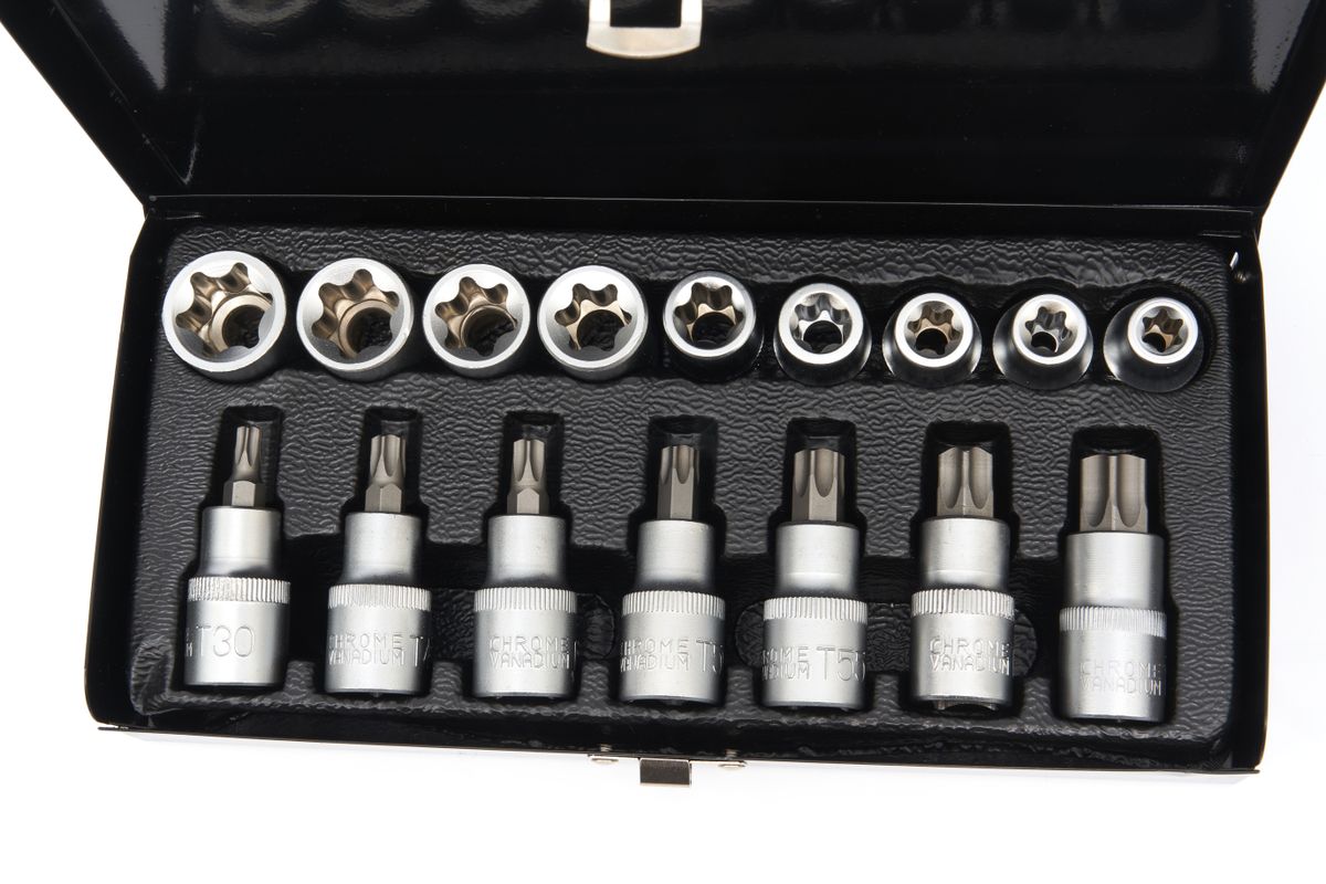 De HBM Inwendige en Uitwendige Torx Doppenset 16 Delig 1/2″ is ideaal voor het los- en vastdraaien van speciale Torx-bouten. Deze uitgebreide set bevat zowel E-profielen (inwendig) als T-profielen (uitwendig), passend voor veelvoorkomende maten. Dankzij de 1/2″ aansluiting zijn de doppen te gebruiken met gangbare ratels en momentsleutels. Gemaakt van gehard staal voor langdurig gebruik.