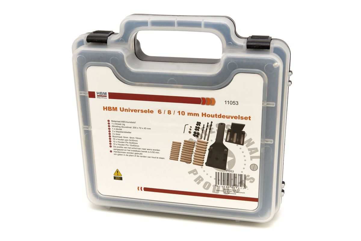 • De HBM Universele 6 / 8 / 10 mm Houtdeuvelset wordt geleverd inclusief 1 deuvelmal 1 inbussleutel 3 klepstandstellers 3 boren (6, 8 en 10 mm) 30 Houten pinnen (6 x 30 mm, 8 x 40 mm, 10 x 40 mm elk 10 stuks) 1 opbergkoffer