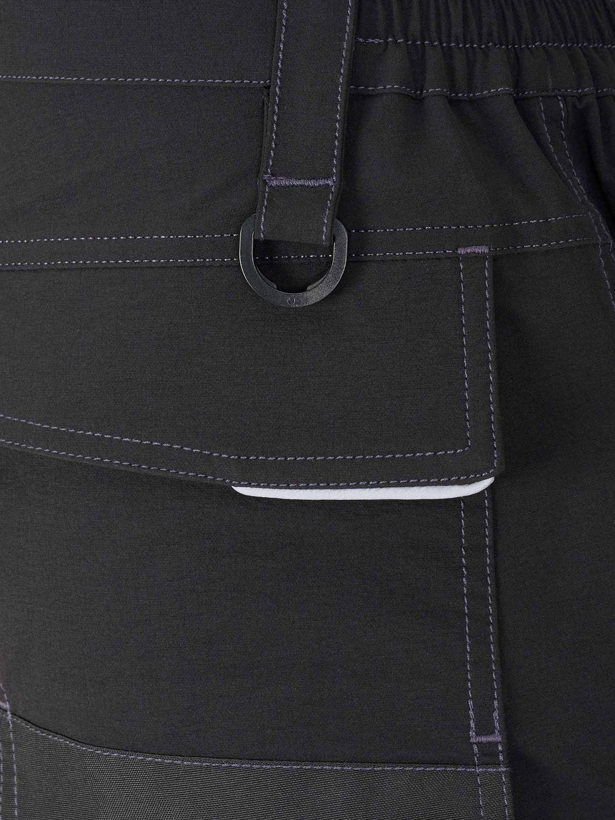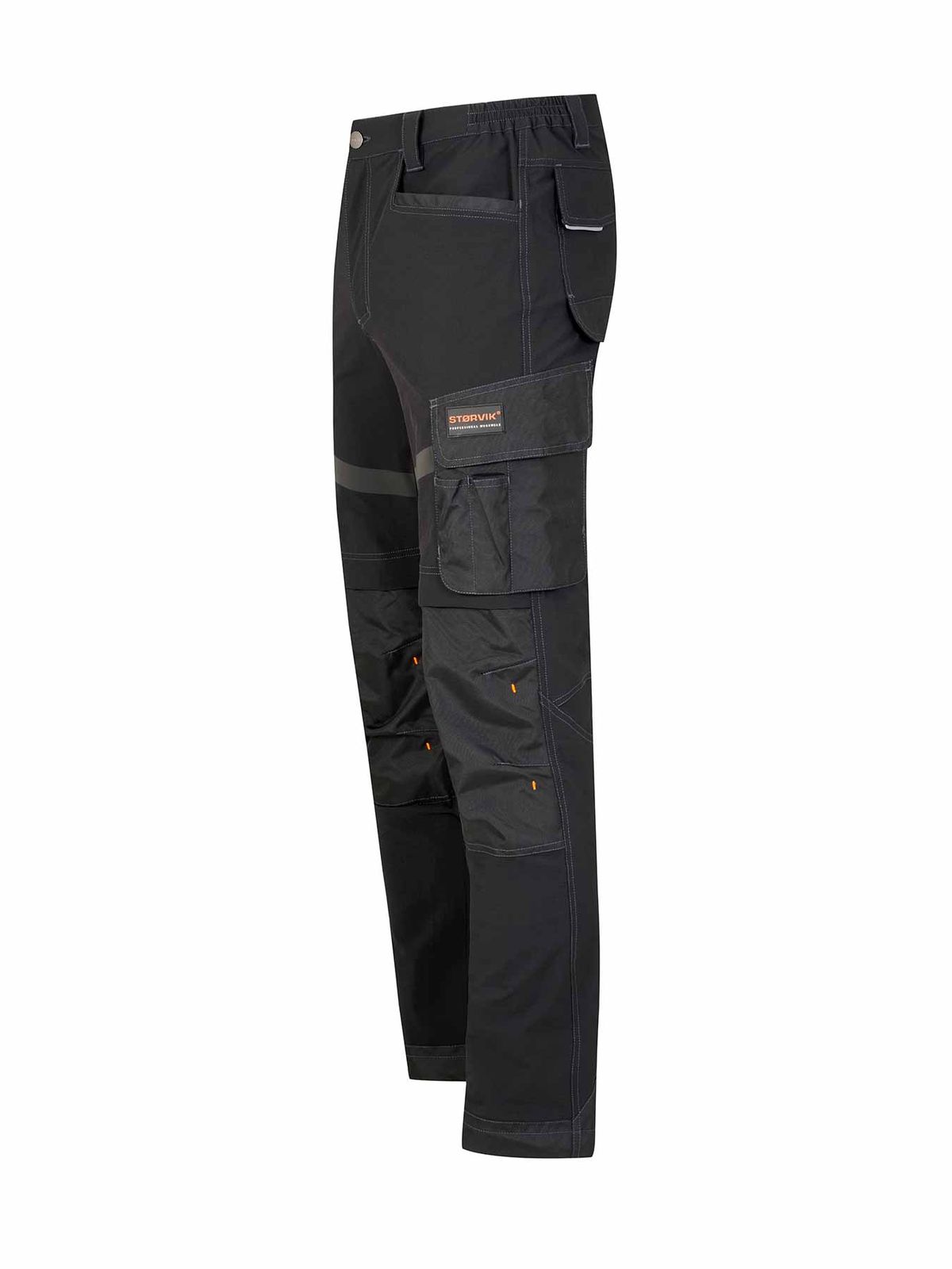 De stretch werkbroek Stef van Storvik biedt optimale bewegingsvrijheid tijdens het werk met 4-way stretch stof. Een elastische tailleband zorgt ervoor dat de broek comfortabel blijft zitten tijdens het bewegen. De samenstelling van de stretch-stof is 92% polyamide en 8% spandex. De stretchbroek heeft Oxford kniestukken die slijtage op de knievlakken van de broek tegengaan. De Oxford polyester stof is eveneens aangebracht aan de binnenzijde van de enkels tegen het slijten door beweging tijdens het lopen. Polyamide stof van de broek is water en vuil afstotend, wat erg handig is om de werkbroek droog en netjes te houden. Deze broek is voorzien van een D-ring en diverse opbergzakken voor gereedschap en andere benodigdheden. Op de rechter dijbeen zijn 2 opgestikte open zakken, een pennenzak en een hamerlus aangebracht. Op de linker dijbeen bevinden zich cargo- en een met klittenband afsluitbare telefoonzak en 2 pennenvakken. Aan de voorzijde zitten 2 open steekzakken en aan de achterzijde 2 met klittenband afsluitbare zakken. Reflectie is aangebracht aan de voorzijde op de bovenbenen en aan de achterzijde ter hoogte van de klepzakken.