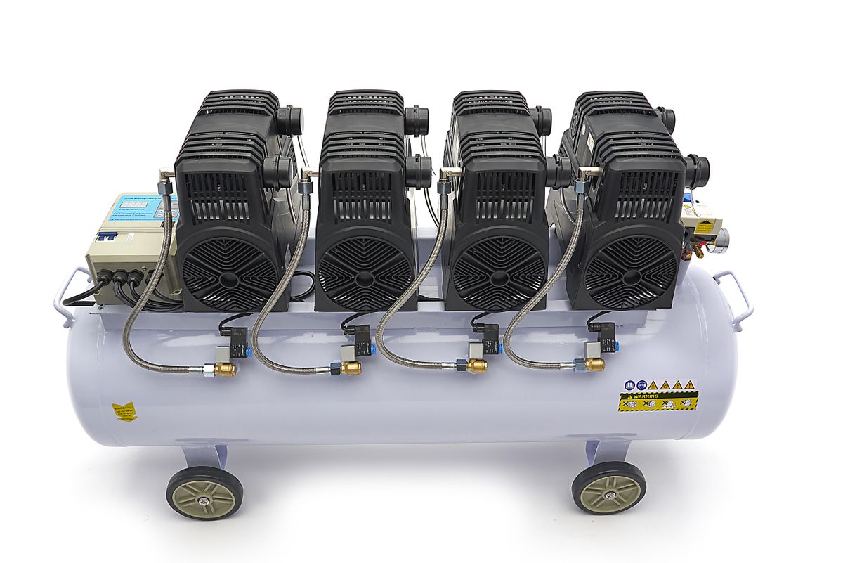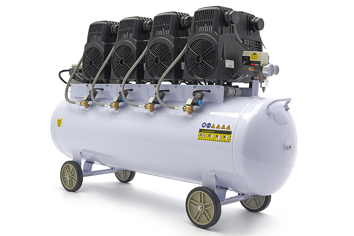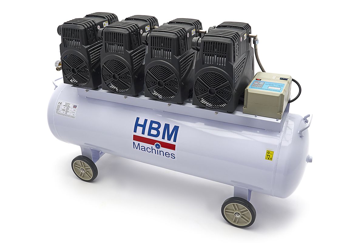Deze olieloze compressor heeft 4 motoren en 8 cilinders en is daarmee de low noise compressor met de grootste luchtopbrengst uit het assortiment. Desondanks is het een van de stilste compressoren die er bestaan. Met zijn 68 dB is deze compressor niet veel luider dan een airco. Deze machine heeft dankzij de combinatie van een grote druktank en een hoge opbrengst, een korte duty cycle. Dat betekent dat de machine niet direct zal aanslaan bij afname van perslucht en bovendien snel weer op druk zal zijn (door de grote opbrengst) en dus na korte tijd al weer op druk is. Dat maakt deze machine extra rustig. De machine dient afgezekerd te worden op 32 Amp. Overige informatie De speciale electronische motor controller heeft tot taak de belasting van het stroomnet te bewaken door elke motor één voor één na elkaar op te starten. Verder behoed de controller elke motor voor overbelasting en schakelt deze een overbelaste motor automatisch uit. Het LED display op de controller laat de status zien van elke motor en waarschuwd als er iets misgegaan is. Eenvoudig de reset knop indrukken is in dat geval genoeg om de controller de machine weer in operationele status terug te laten brengen. (Uiteraard is het dan wel de bedoeling om eerst na te gaan hoe het kwam dat een motor overbelast werd, want dat gebeurd enkel als er iets defect is geraakt). Dit is een spectaculair stille compressor met grote prestaties en met een grote mate van automatisering, die bedoeld is voor langdurig gebruik en die een grote opbrengst heeft en daarmee geschikt is voor alle perslucht gerelateerde werkzaamheden en gereedschappen inclusief kleine klusjes voor het stralen! Aangezien onze LOW NOISE compressoren van TOP kwaliteit zijn worden deze geleverd met maar liefst 5 jaar garantie!