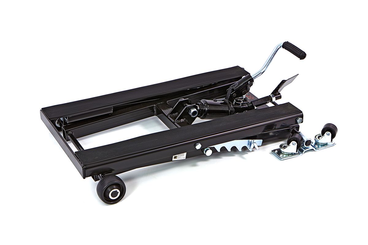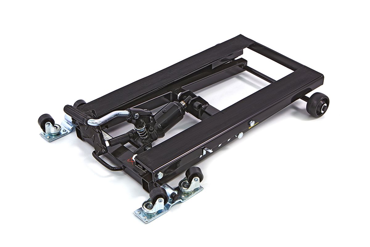 De zeer stabiele en verplaatsbare Harley motorlift is het ultieme apparaat dat elke Harley eigenaar in huis zou moeten hebben. De Harley Motorlift is speciaal gebouwd voor motorfietsen tot 500kg. Door zijn eenvoud en robuuste vorm is deze motorlift voor iedereen gemakkelijk in gebruik. De Harley motorlift bevat 4 zwenkwielen en 2 vaste wielen, dit maakt het mogelijk om de motorlift simpel onder uw Harley te rijden. Daarnaast bevat deze stevige Harley motorlift ook nog eens over een ergonomisch (voet)bediening om uw motorfiets op te tillen en een lange manoeuvreer-stang voor het verplaatsen! De Harley motorlift is een lift waarbij u veilig, schadevrij en verantwoord te werk gaat. Het plateau waar de motorfiets komt op te staan is voorzien van een dikke rubberen laag, dit zodat u nooit beschadigingen krijgt aan uw motorfiets tijdens het tillen. De motorlift is op vier verschillende hoogtes in te stellen en bevat een vier trapsbeveiliging. Deze beveiliging zorgt ervoor dat uw lift altijd automatische vergrendeld wordt tijdens het liften. Bij het dalen wordt de lift gedempt naar beneden gelaten door middel van een voet(bediening). Het liften van uw motorfiets zorgt ervoor dat u efficiënt aan uw Harley en andere custom motoren kan sleutelen en schoonmaken. De Harley Motorlift geeft u stabiliteit, veiligheid, gemakzucht en zorgt daarnaast voor veel vrijheid in uw werkplaats door de verrijdbare wielen. De motorlift is verkrijgbaar in de kleur rood en zwart.