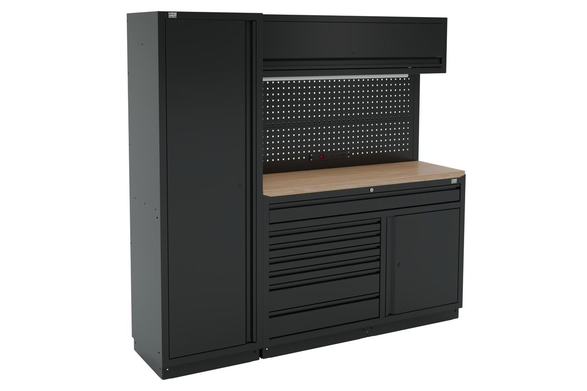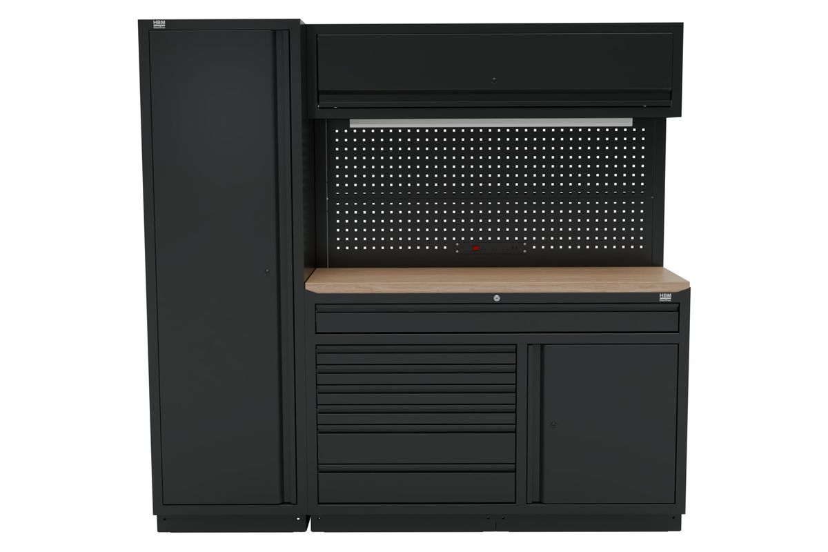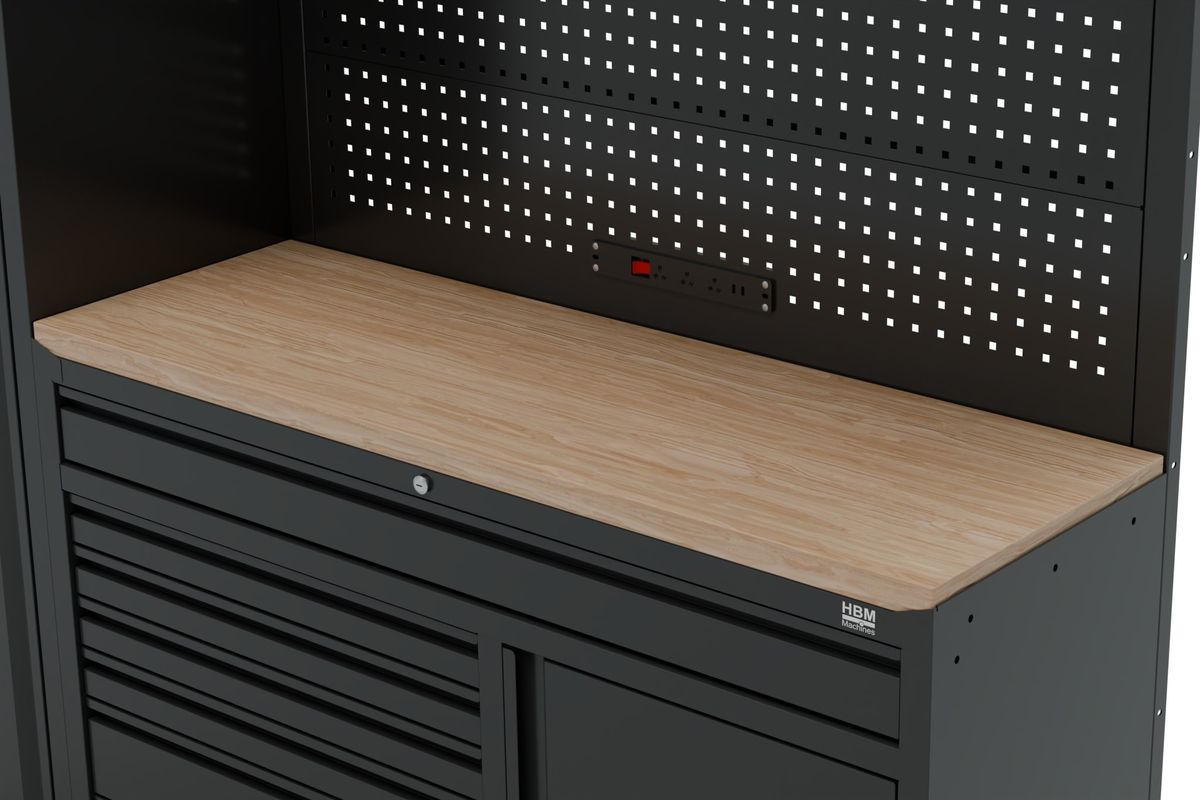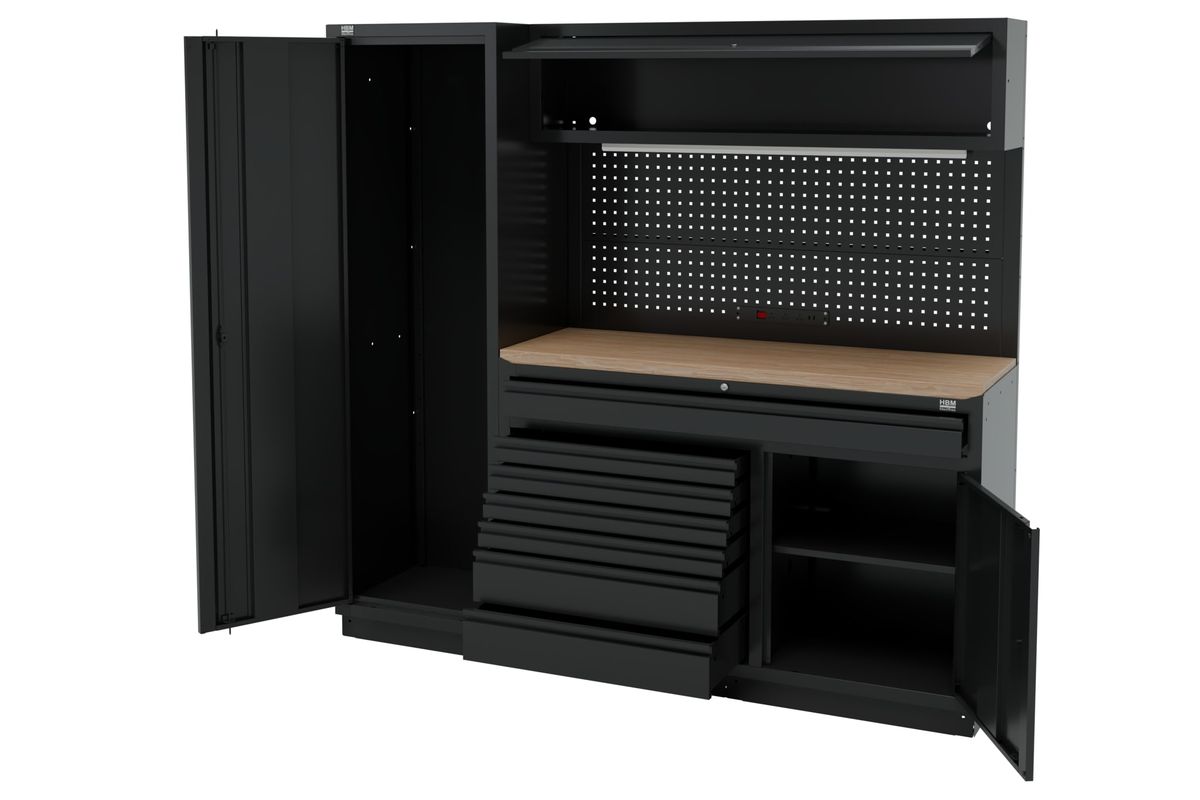 De HBM modulaire werkplaatsset 6-delig, zwart is een praktische en robuuste oplossing voor een georganiseerde werkplek. Dit systeem biedt volop opbergruimte met een hoge kast, een ladenblok en een opbergkast, zodat je gereedschap en accessoires praktisch kunt opbergen en ordenen. Het ladeblok is voorzien van een extra brede lade van 137,2 cm, ideaal voor het opbergen van groter gereedschap en toebehoren. Het ingebouwde stekkerblok maakt het eenvoudig om elektrisch gereedschap aan te sluiten, terwijl de LED-verlichting zorgt voor goed zicht tijdens het werken. Het stevige houten werkblad biedt een solide en duurzame werkruimte. Een ideale keuze voor zowel professionals als doe-het-zelvers die hun werkplek efficiënt en opgeruimd willen houden.