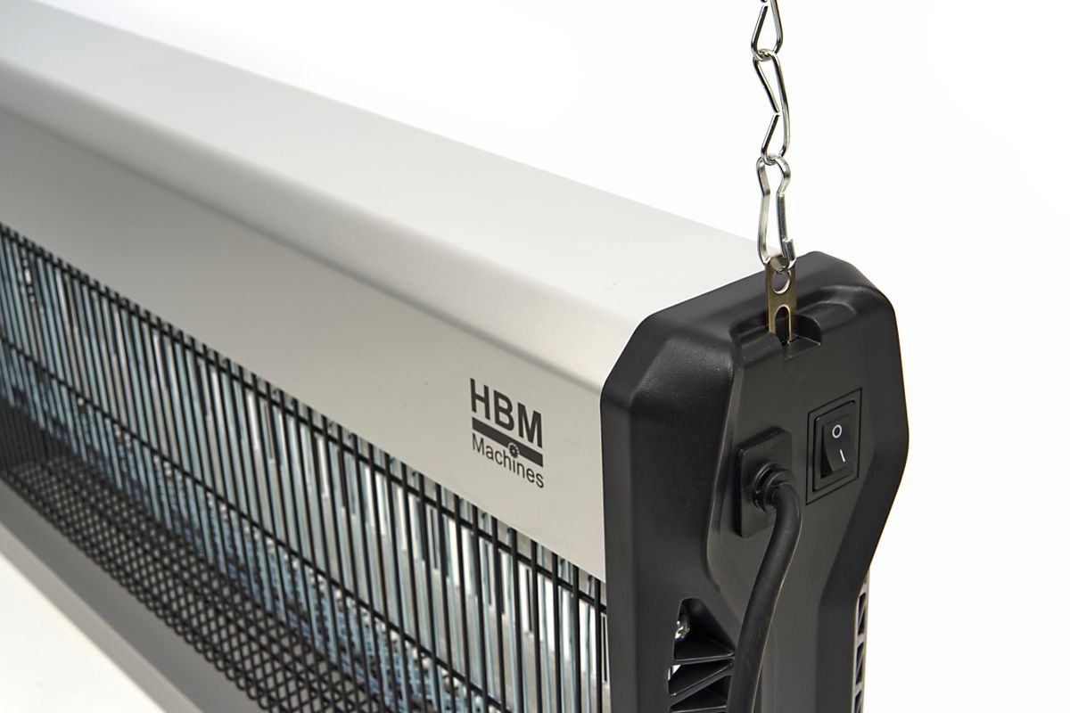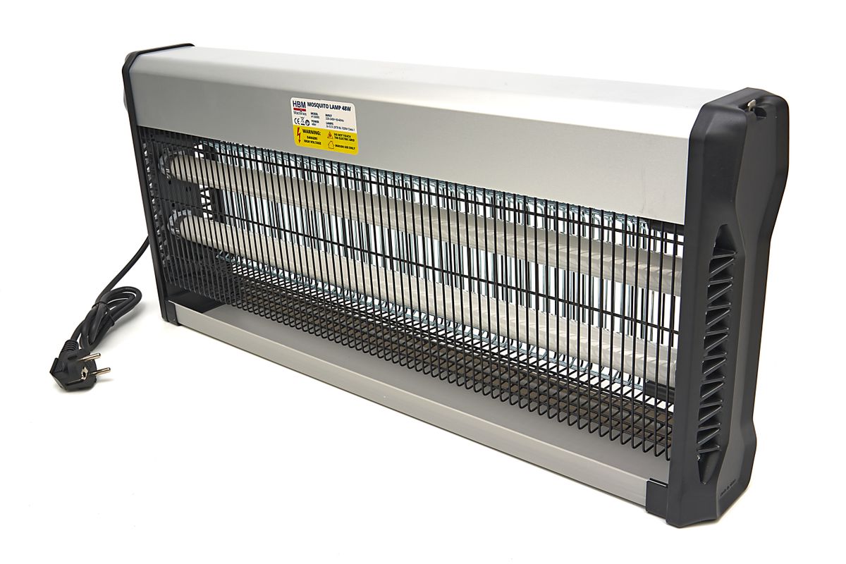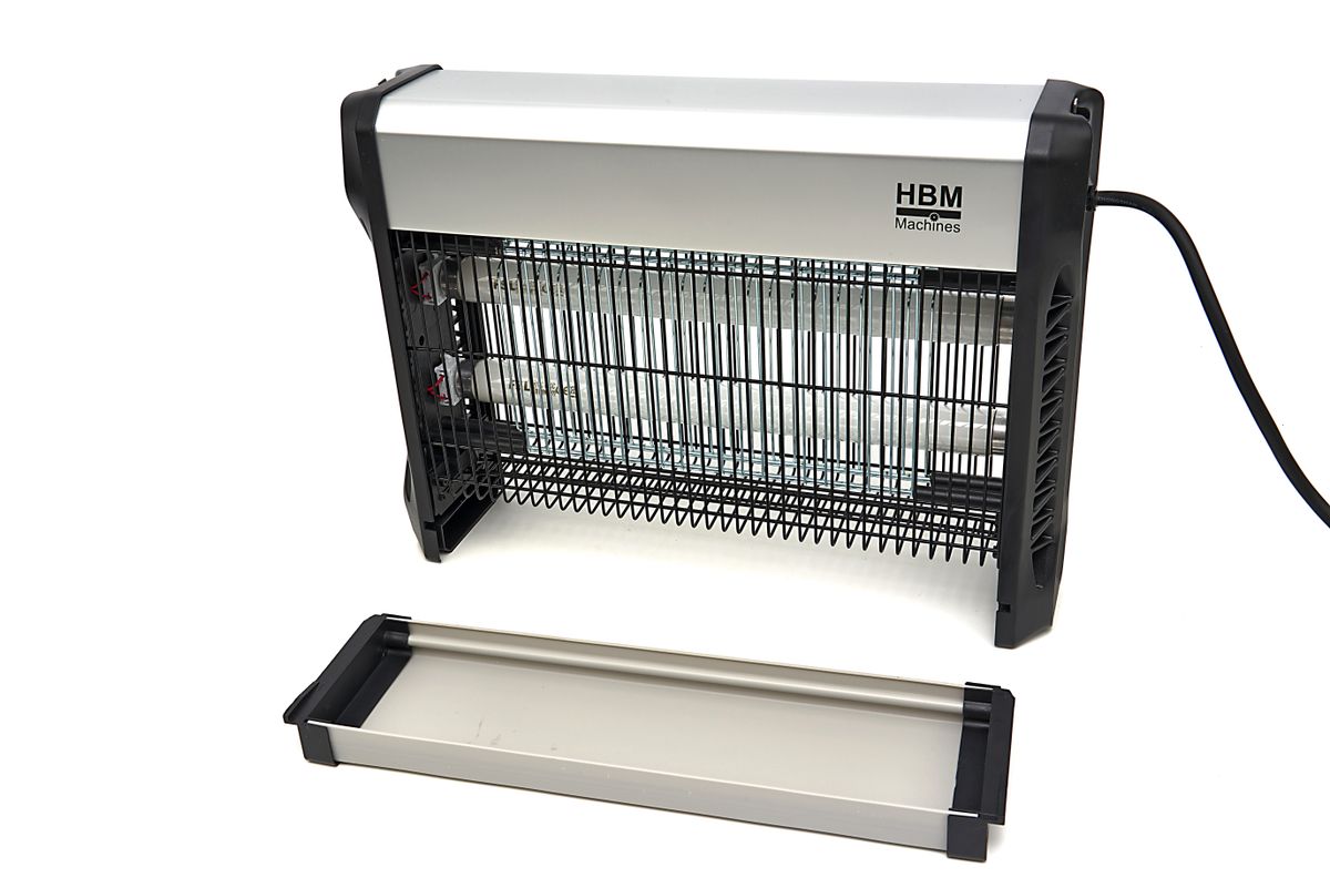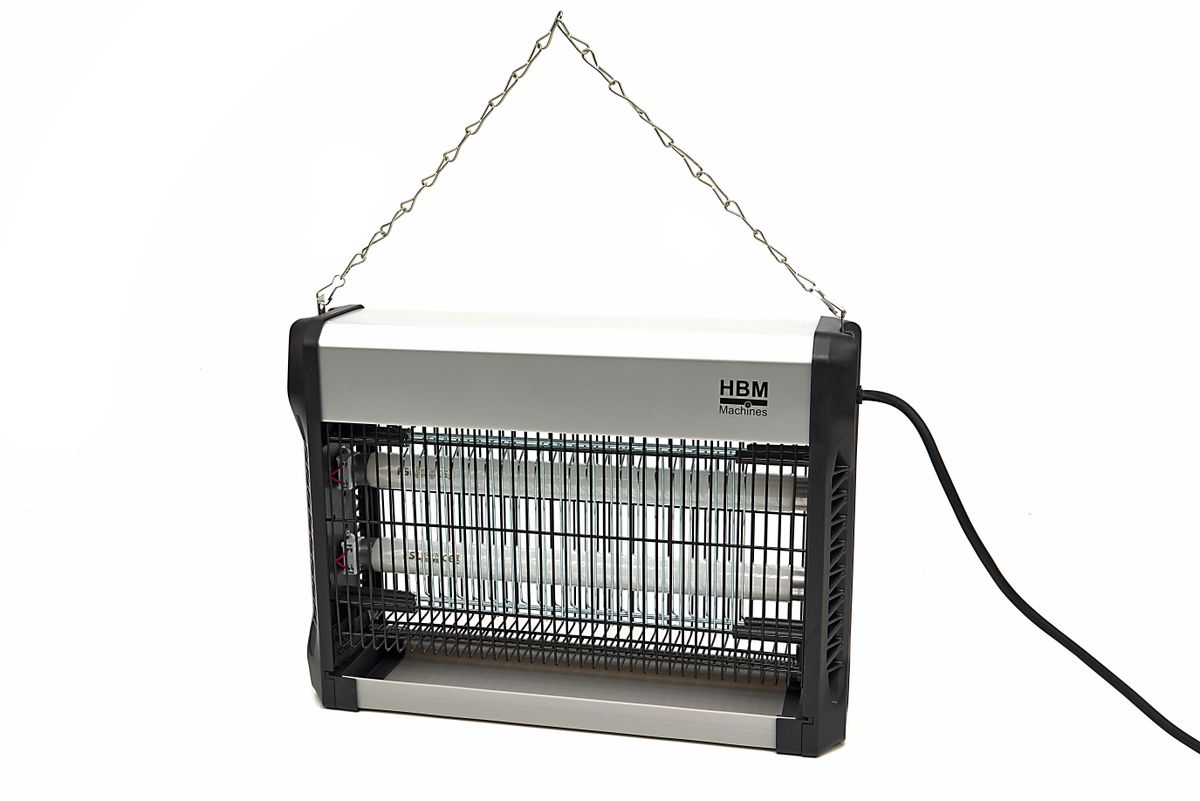 Deze HBM Insectendoder – Vliegendoder – Muggenlamp lokt muggen en andere insecten via zijn blauw UV-licht en elektrocuteert ze vervolgens door middel van het spanningsrooster. De lamp is zowel vrijstaand te gebruiken als aan een plafond te monteren met de meegeleverde ketting. De lamp werkt het beste wanneer er zo weinig mogelijk ander licht aanwezig is. De lamp mag alleen worden gebruikt in afgesloten ruimtes.UV-apparaten mogen namelijk niet buitenshuis worden gebruikt, aangezien niet-selectieve insectenvangers (apparaten met UV-licht als lokmiddel) daar niet alleen schadelijke, maar ook nuttige insecten vangen. De insectendoder is er in twee uitvoeringen. Een compactere 20 watt uitvoering (H130096) een grotere en krachtigere 40 watt versie (H130095).