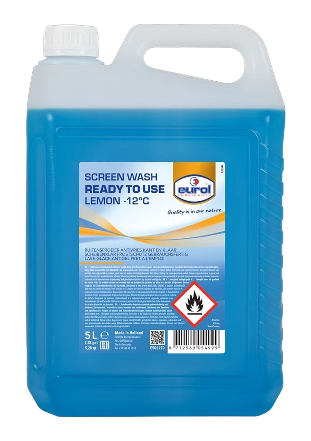 Eurol Screenwash Lemon -12°C is een uitstekende reiniger van vieze autoruiten en voorkomt het bevriezen van het ruitensproeiersysteem. Eurol Screenwash Lemon -12°C heeft een frisse limoengeur en laat geen strepen op de ruiten na. Bovendien is Eurol Screenwash Lemon -12°C niet corrosief, niet schadelijk of irriterend en heeft een vlampunt boven de 23°C, zodat het veilig kan worden gebruikt. Eurol Screenwash Lemon -12°C zorgt ervoor dat de ruitenwisser soepel en zonder horten of stoten het glas droog trekt. Rubbers, lakken en polycarbonaat worden door deze ruitensproeivloeistof niet aangetast. Eurol Screenwash Lemon -12°C is gebaseerd op ethanol en kan overdund gebruikt worden. Niet gebruiken bij temperaturen lager dan -12°C.