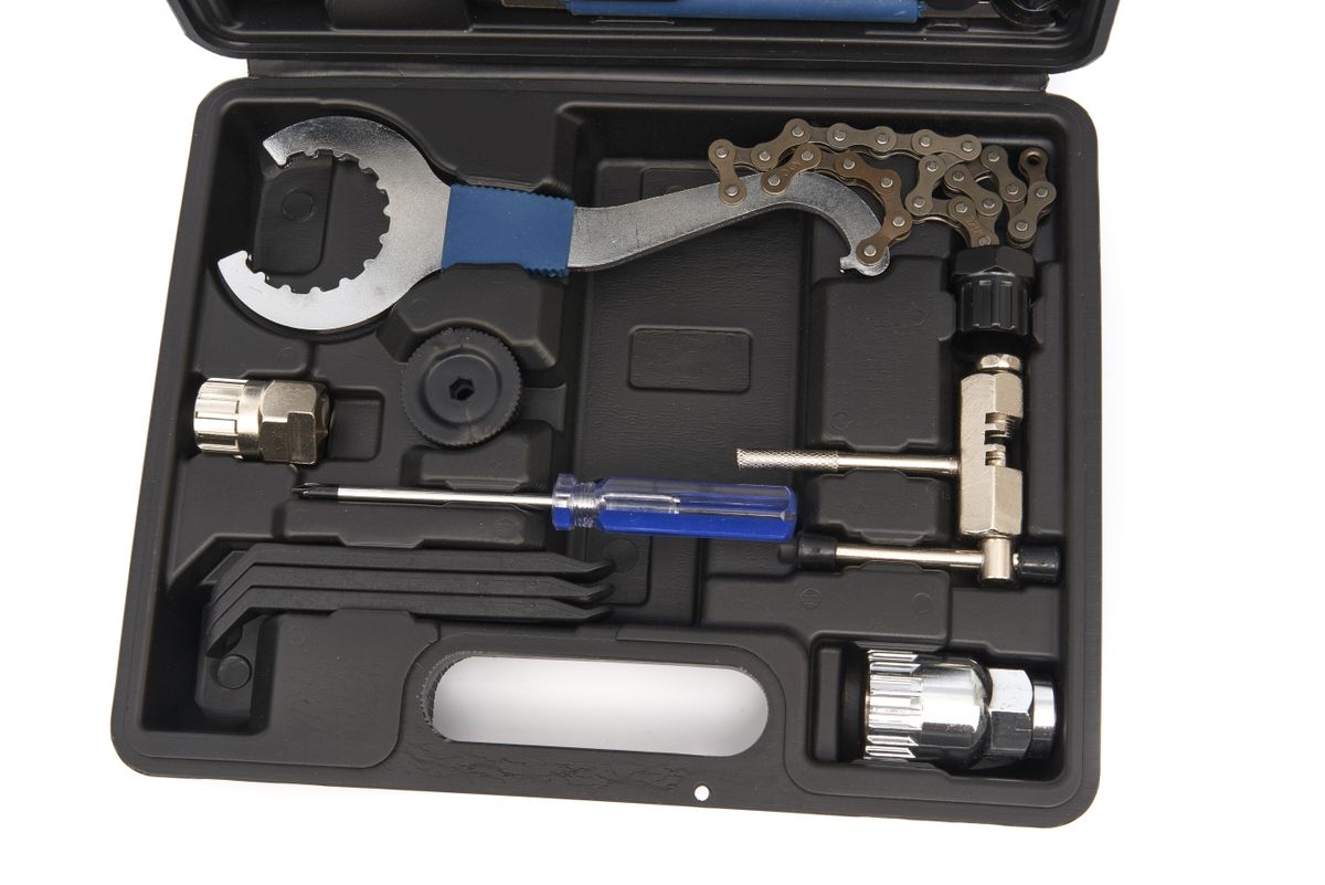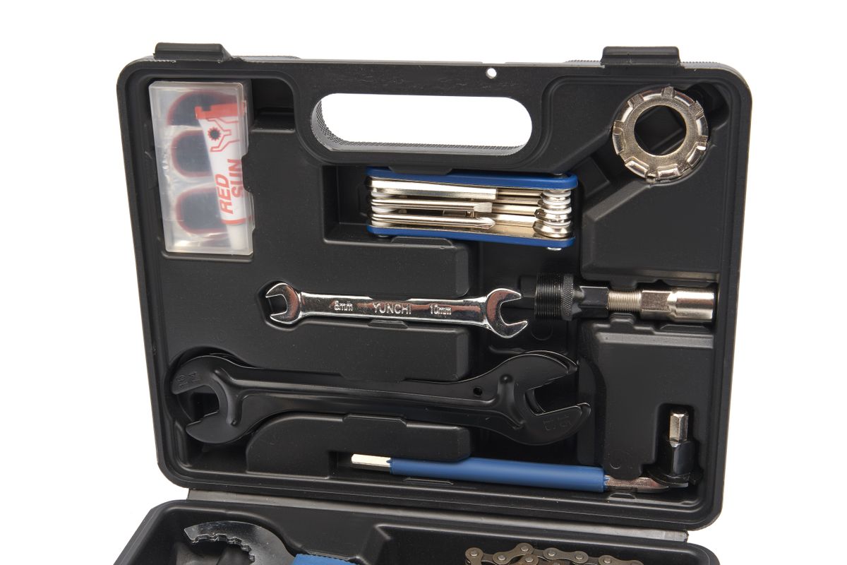 De HBM fietsgereedschap set 18-delig in koffer biedt de essentiële tools voor het onderhouden van je fiets. De set bevat onder andere steeksleutels, bandenlichters, een kettingpons, multitool en diverse inbussleutels, ideaal voor het uitvoeren van reparaties en het afstellen van je fiets. Met handige accessoires zoals een fietscassette-afnemer, cranktrekker en trapassleutel heb je alles wat je nodig hebt binnen handbereik. De set wordt geleverd in een stevige koffer, zodat je gereedschap altijd georganiseerd en gemakkelijk bereikbaar is, zowel thuis als onderweg.