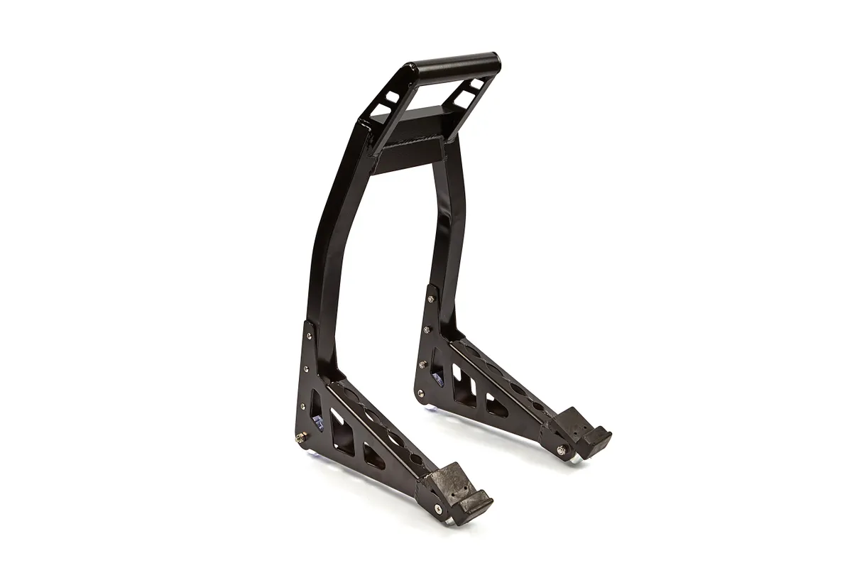De aluminium MotoGP paddockstand in de kleur mat zwart is perfect voor het wegzetten van uw motor. De paddockstand plaatst u eenvoudig en snel onder de voorvork van uw motorfiets. De aluminium paddockstand is speciaal ontwikkeld voor het circuit en heeft een krachtige en stoere uitstraling. Het materiaal, aluminium, zorgt ervoor dat u de paddockstand eenvoudig verplaatst in uw werkplaats, circuit of in uw garage. De paddockstand weegt slechts 3 kilogram en heeft een belastbaar vermogen van 250 kg. Hierdoor is deze paddockstand voor bijna iedere motor geschikt. Een must voor op het circuit. De lichtgewicht paddockstand is vervaardigd uit aluminium en is hierdoor erg licht. De aluminium paddockstand zorgt ervoor dat u motor hoog en stevig komt te staan. Hierdoor kunt u razendsnel en veilig de bandenwarmers van uw motor halen. Dat is nog eens super snel het circuit op! Bij de paddockstand worden 5cm brede rubberen adapters geleverd zodat u motor niet beschadigd.
