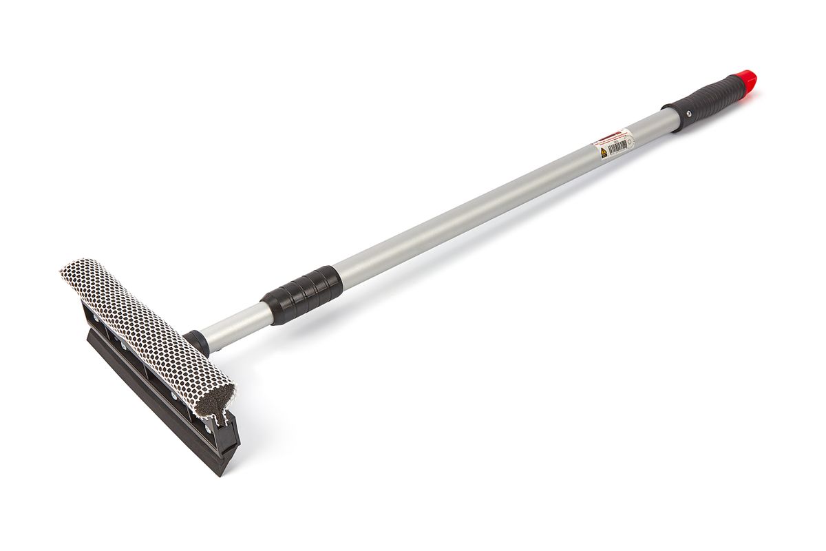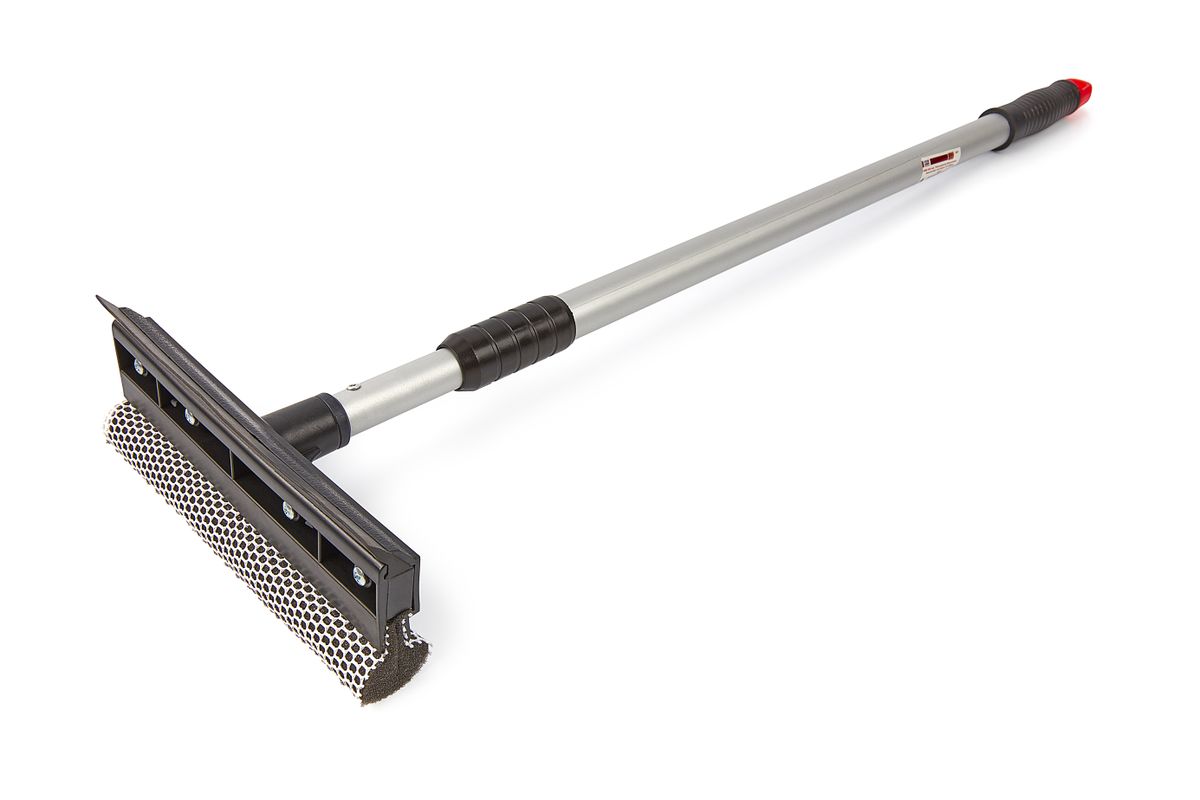 Zwarte raamwisser op een telescopische steel die verstelbaar/ uitschuifbaar is van 70 tot 110 cm lang. De raamwisserkop heeft 2 zijdes: 1 met een spons die verstevigd is met een netstructuur, voor verwijdering van hardnekkig vuil en insecten van de ruit. En 1 zijde met een trekker voor het droogtrekken van de ruit.