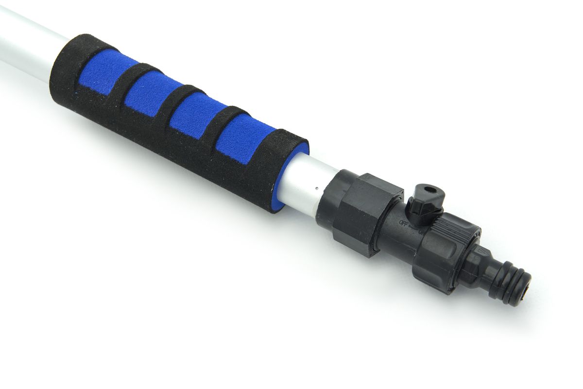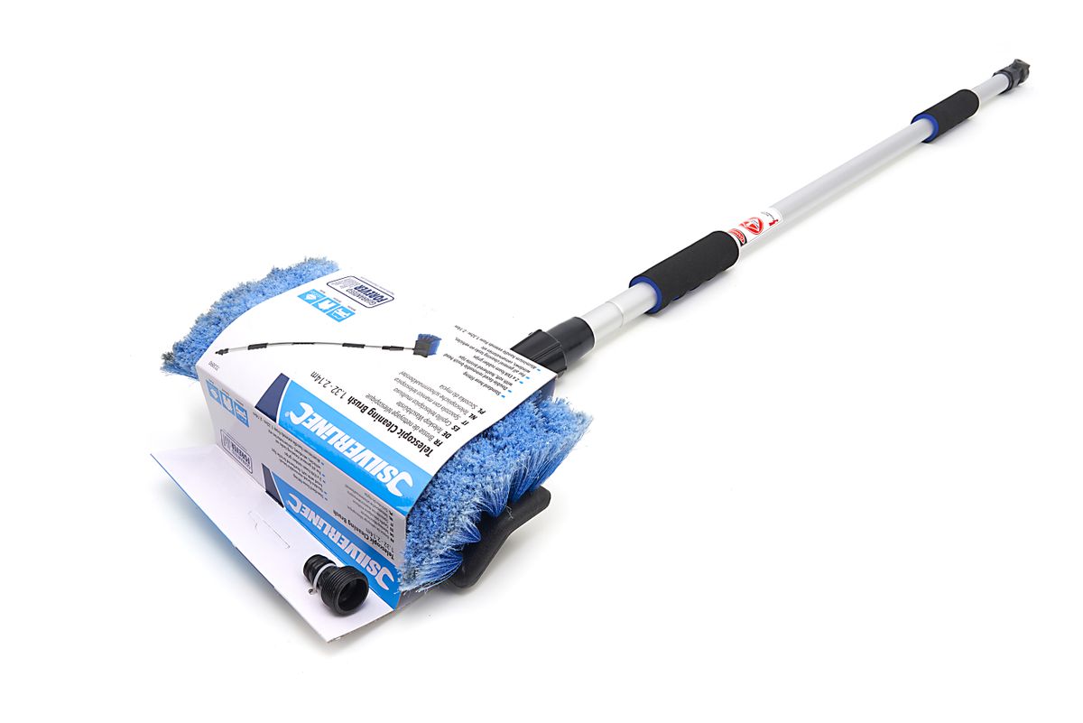 Telescopische schoonmaakborstel voor algemene schoonmaakwerkzaamheden op voertuigen, ramen, etc. Deze wasborstel heeft een standaard slangaansluiting met zachte borstelharen op een dubbelzijdige, afneembare kop. 2 schuimrubberen grips en een handige waterschakelaar. De licht aluminium steel is uitschuifbaar van 1,32 mtr tot 2,14 mtr.