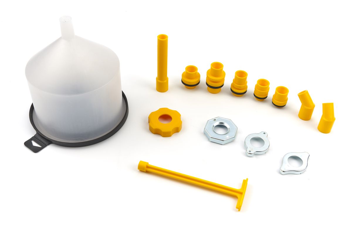 Deze zeer complete trechterset is voor het bijvullen van koelvloeistof reservoirs van auto’s. De grote doorzichtige trechter, die tevens reservoir is, laat het vloeistofniveau duidelijk zien. De bijgeleverde zwarte deksel beschermt tegen invallende stof- en vuildeeltjes tijdens het leegstromen van de trechter. Met deze trechterset kunt u de juiste hoeveelheid koelvloeistof in één keer in de trechter leeggieten, waarna de vloeistof langzaam, zonder bellen, kan leegstromen uit de trechter naar het koelvloeistof reservoir. Men hoeft dus niet meer steeds een beetje bij te gieten, met als gevolg dat men steeds het risico loopt te morsen, waardoor drijfriemen besmeurt worden met koelvloiestof en gaan piepen. Deze set wordt compleet geleverd met vele adapters en verloopstukken, zodat er altijd een passing te vinden is voor ieder automerk dat in Europa verkrijgbaar is. Zelfs voor koelvloeistof reservoirs die onder andere onderdelen verborgen zitten, worden verlengstukken en knie stukken meegeleverd. Morsvrij en luchtbelvrij koelvloeistof bijvullen doet u met deze set!