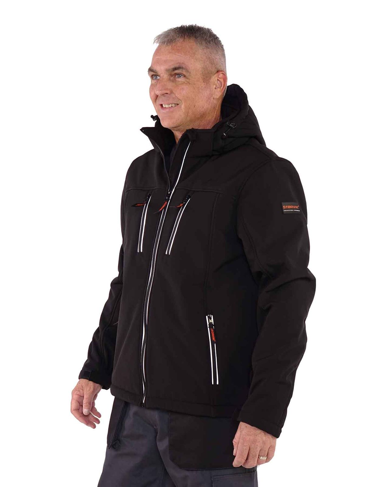 Zoek je goede werkkleding om jezelf goed warm te houden tijdens het werken in de bouw, in de tuin of bij het klussen rond het huis. Dan is de Clive Softshell Werkjas Zwart van STØRVIK een uitkomst. Hiermee werk je het hele jaar door. De Clive is voorzien van een warme teddy voering. Ook beschermt de softshelljas tegen wind door de flap achter de rits die dient als windvanger, de met teddy gevoerde kraag en (afritsbare en verstelbare) capuchon. De boord op de heupen is verstelbaar met een elastisch koord en de uiteinden van de mouwen zijn verstelbaar met klittenband. Deze softshelljas draagt comfortabel door de stretchstof (96% polyester 4% spandex) en is ook buiten het werk prettig om te dragen. De functionele jas heeft een ademend vermogen en is voorzien van reflecterende details op de voor- en achterzijde en heeft opbergzakken op de borst, heupen (met rits) en een binnenzak.