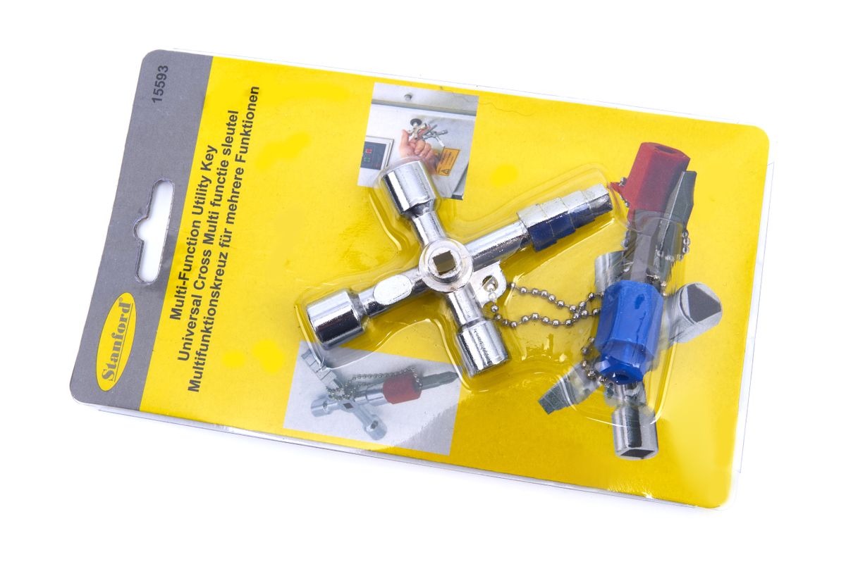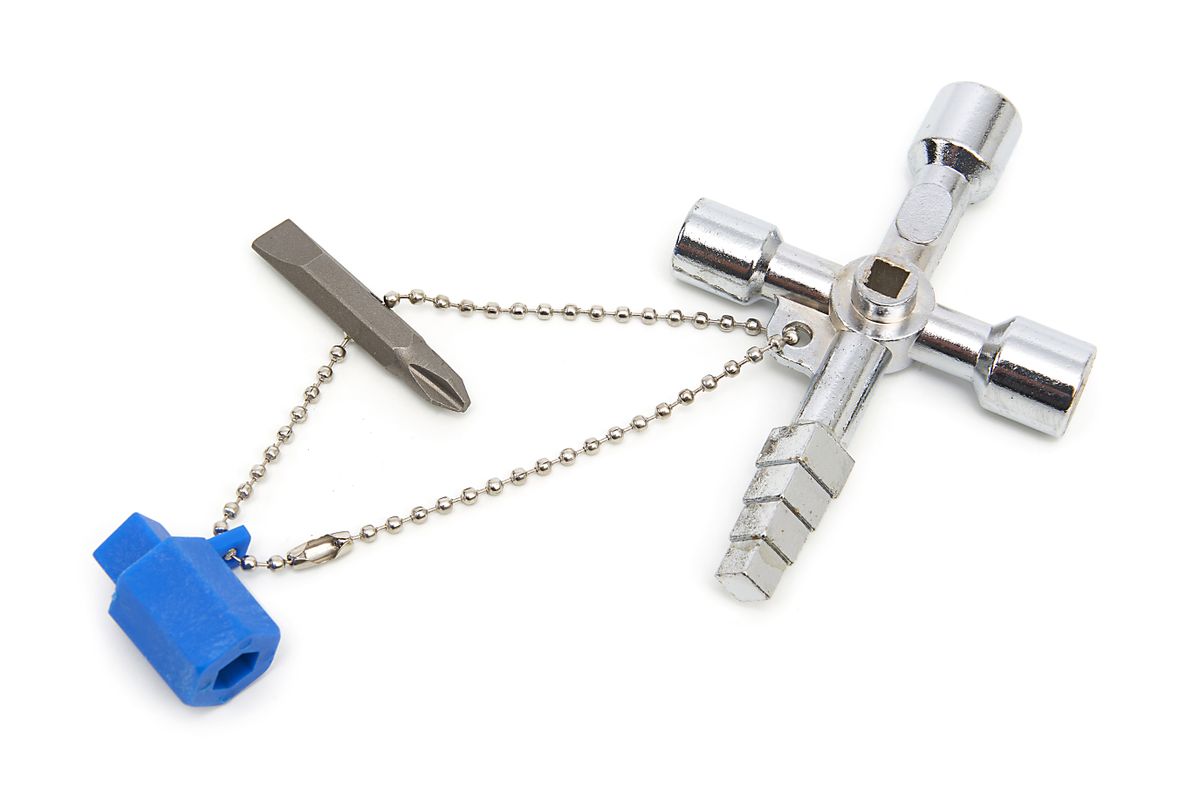Elektrische schakel- en regelkasten, zoals telecom- / internet hubs in de straat, of de schakelkasten van de netwerkbeheerder in de buurt, moeten niet door iedereen zomaar opengemaakte kunnen worden. Tegelijkertijd moeten schakelkasten vaak wel door de diverse onderhoudstechnici van de diverse bedrijven geopend kunnen worden. Dat is waarom je op dergelijke kasten vaak geen echte unieke sleutels tegenkomt, maar meer algemene sleutels. Deze algemene sleutel hebben vaak vreemde vormen, zoals driehoekige dopmoeren of vierkante inbussleutels.Deze universele sleutel is bedoeld voor dergelijke schakelkasten en bevat een flink aantal “algemene” schakelkastsleutels, samengevoegd in één handig compact gietstuk. Om het helemaal compleet te maken is er ook een bithouder en een toolbit toegevoegd die met een kettinkje aan het gietstuk is bevestigd.