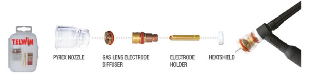 Deze Telwin Crystal Clear Cup Box 2,4mm is bedoeld voor de TIG toortsen ST17, ST18 en ST26. De box bestaat uit een Pyrex nozzle/ mondstuk, elektrode adapter met kijkglas, elektrode diffuser, elektrode houder, een hitteschild en een O-ring. Deze set is geschikt voor elektrodes van 2,4mm in doorsnee. De voordelen van het gebruik van deze Crystal Clear Cup Box is dat u een beter zicht heeft op het smeltbad waardoor u met hogere precisie kunt lassen. Verder is het resultaat een mooiere las omdat omdat de gasdoorvoer constanter en gerichter verloopt. En uw verbruiksartikelen/ consumables gaan langer mee vanwege een verlaagde kans op vervorming. En dit laatste zorgt dan weer voor lagere kosten.