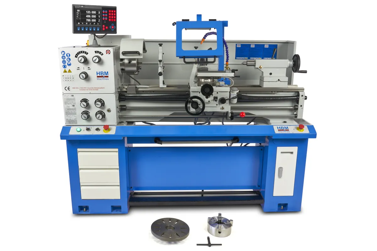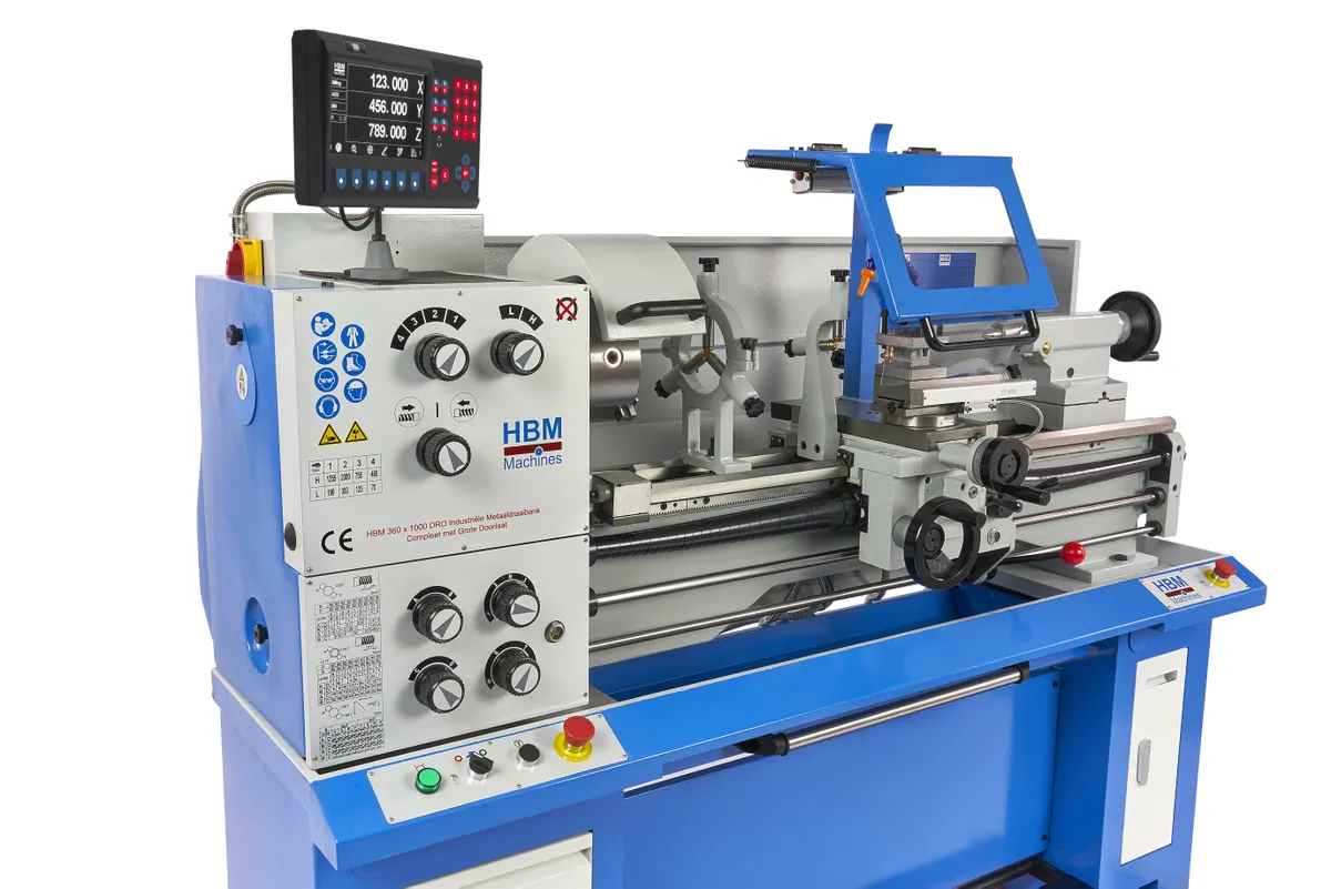 De HBM 360 x 1000 Metaaldraaibank Compleet met Grote Doorlaat en 3-Assig LCD Digitaal Uitleessysteem (400 Volt) is een krachtige en veelzijdige machine voor het nauwkeurig bewerken van staal, niet-ferrometalen en diverse metalen werkstukken. De ruime doorlaat, geharde en geslepen hoofdspindel en het duurzame prismabed uit gietstaal bieden optimale prestaties en precisie. De draaibank heeft een instelbaar toerentalbereik van 70 tot 2000 omwentelingen per minuut en beschikt over nauwkeurige toerental- en voedingsinstellingen. De elektromechanische voetrem vermindert steltijden, terwijl de naar voren uittrekbare spanenbak zorgt voor een ruimtebesparende opstelling. De machine is voorzien van LED-verlichting, een nulspanningsbeveiliging en een complete koelinrichting. De levering omvat een losse en vaste bril, een opspanplaat en bijbehorend gereedschap, zodat je direct aan de slag kunt met professioneel draaiwerk. Met zijn robuuste constructie en doordachte functies is deze metaaldraaibank een betrouwbare keuze voor elke professionele werkplaats.