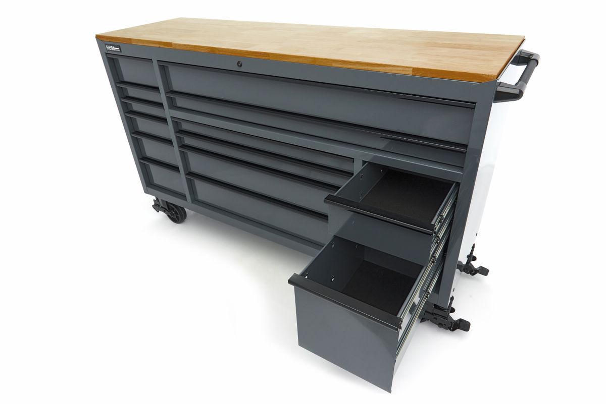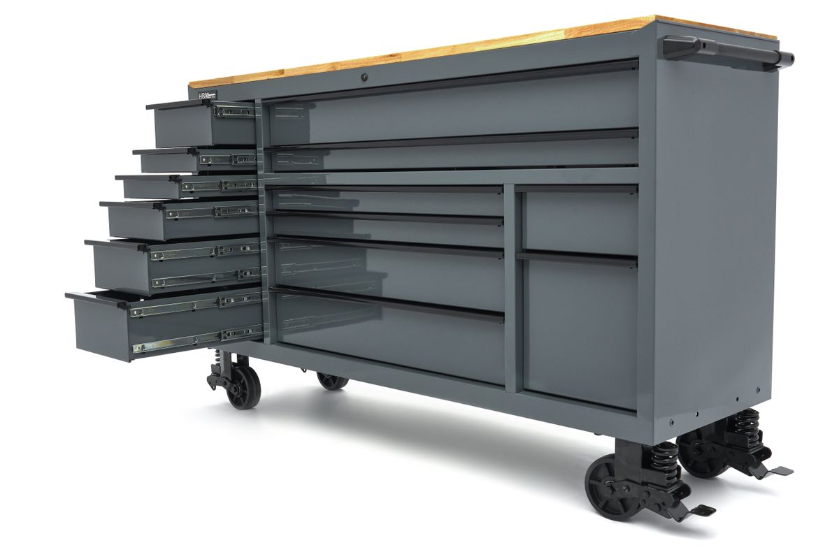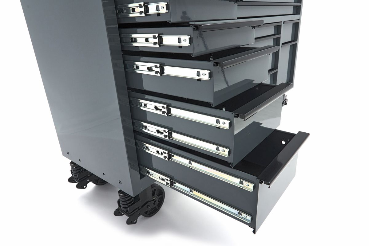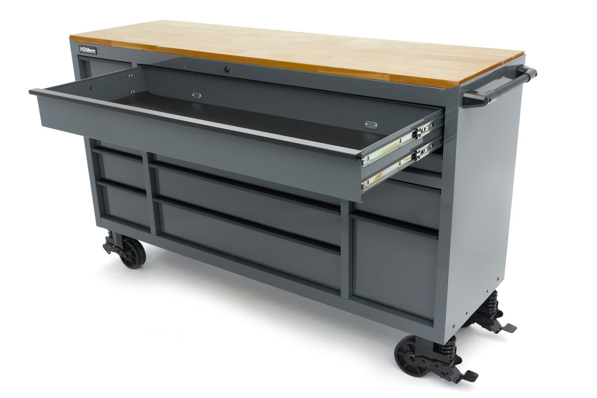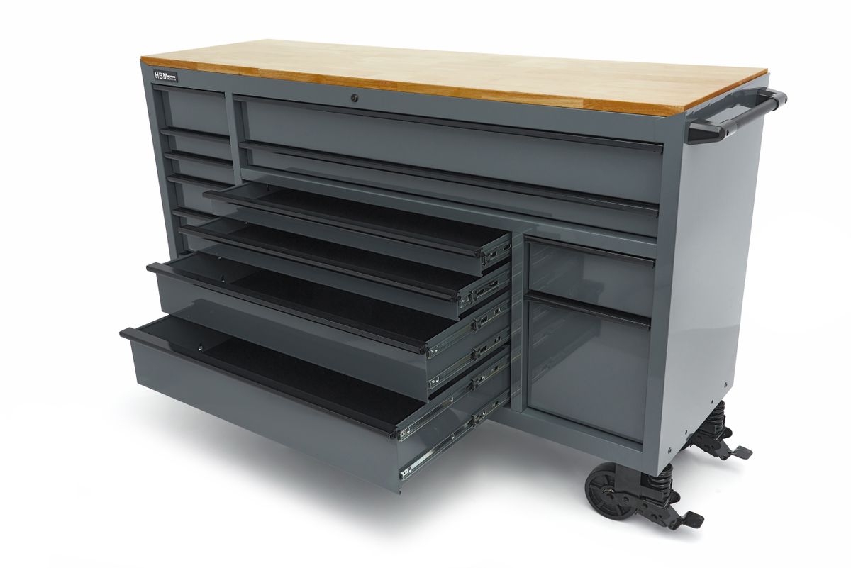 De verrijdbare gereedschapswagen die je in staat stelt overal te werken, ongeacht of je een professional bent of een enthousiaste doe-het-zelver. Dat is wat de HBM 182 cm Gereedschapswagen voor je heeft. Deze multifunctionele gereedschapswagen maakt het eenvoudig om flexibel te werken en klusjes op locatie uit te voeren. Met 14 laden in verschillende maten, heb je al je gereedschap en onderdelen netjes georganiseerd en altijd binnen handbereik. Het stevige bovenblad van deze gereedschapswagen biedt een duurzaam werkoppervlak en zorgt voor een solide basis voor al je klussen. Of je nu fijn werk doet of grotere projecten aanpakt, je kunt altijd rekenen op een betrouwbaar werkoppervlak. Het veelzijdige ladenblok biedt een ideale opbergoplossing voor al je gereedschap. Je raakt zelfs de kleinste schroefjes niet meer kwijt. Alle laden kunnen volledig worden uitgeschoven, wat betekent dat je elke centimeter kunt benutten en altijd overzichtelijk en efficiënt kunt werken.