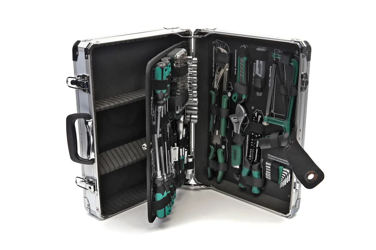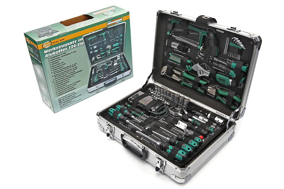 Deze mooie gereedschapskoffer zit vol met de meeste gebruikte tools in en rond het huis. Ook voor professionals is dit een uitstekende basisset. Meer dan 120 items van hoogwaardig staal, geleverd in een stevige koffer en voorzien van een uitstekend prijskaartje. Over de Mannesmann 124 Delige Gereedschapskoffer Met deze gereedschapskoffer haal je in één klap zo’n beetje alle basisgereedschap dat je nodig hebt in huis. Met de meer dan 100 messen, tangen, zagen, schroevendraaiers, inbussleutels, bitjes en nog veel meer hoogwaardige gereedschappen heb je voor praktisch elk klusje het juiste gereedschap direct bij de hand.