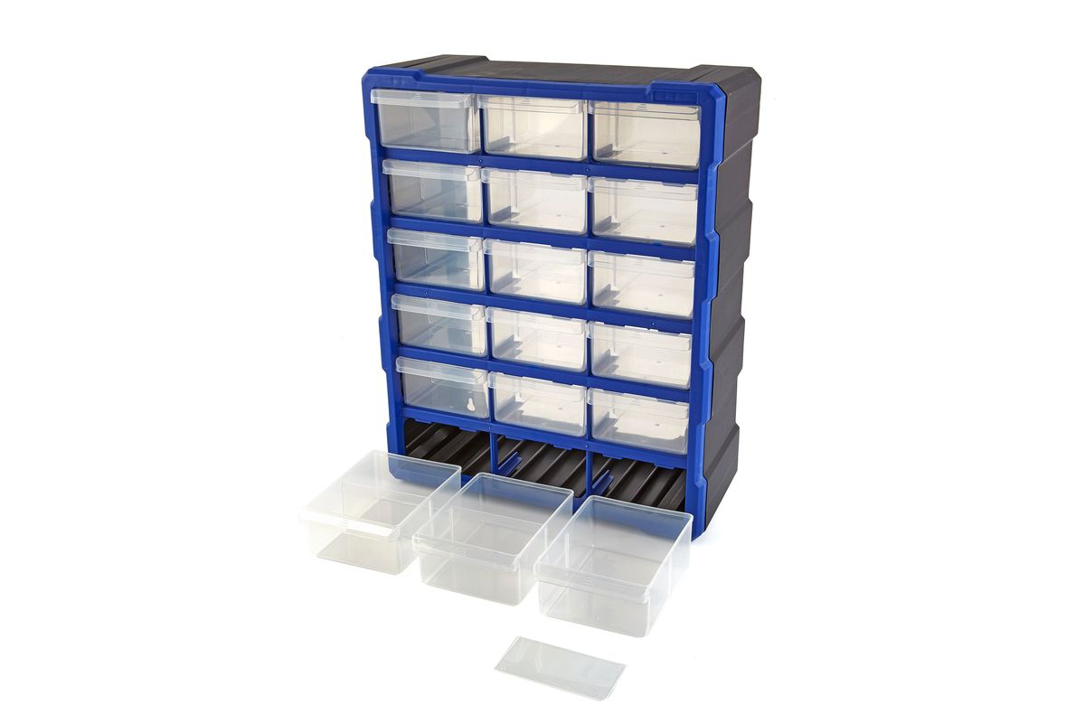 Alles in een oogopslag, alles mooi gescheiden: het veelzijdige magazijn voor kleine onderdelen zorgt voor orde met een systeem. De 18 transparante schuifvakken zijn ideaal geschikt als bewaarplaats voor schroeven, onderdelen, Lego, juwelen en nog veel meer. De flexibele modules kunnen volledig verwijderd worden. Indien nodig kan het aantal vakken door scheidingsplanken tot het 4 voudige verhoogd worden. De twee ophangmogelijkheden van het stabiele kunststofframe garandeert stevigheid aan de wand bij een volle lading. Geen wirwar, geen moeizaam zoeken meer met het praktische magazijn voor kleine onderdelen. Losse tussen schotten zijn niet te verkrijgen