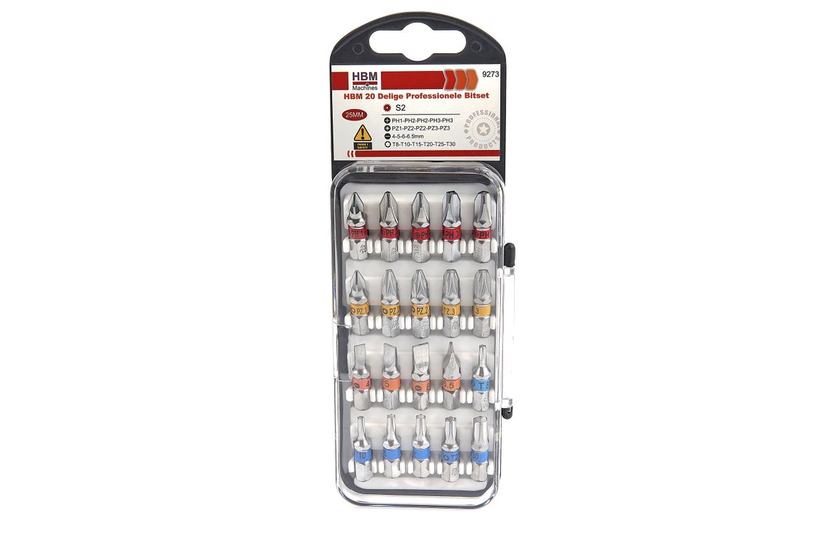 Met de HBM 20 Delige Professionele Bitset heeft u altijd een geschikt bitje bij de hand! De bitjes zijn gemaakt van top kwaliteit S2 staal en zijn voorzien van kleurcodering. Inclusief sleuf, kruiskop (PH) en pozidriv (PZ) bits en torx in verschillende maten! De bitjes zitten in een overzichtelijke houder met zichtvenster.
