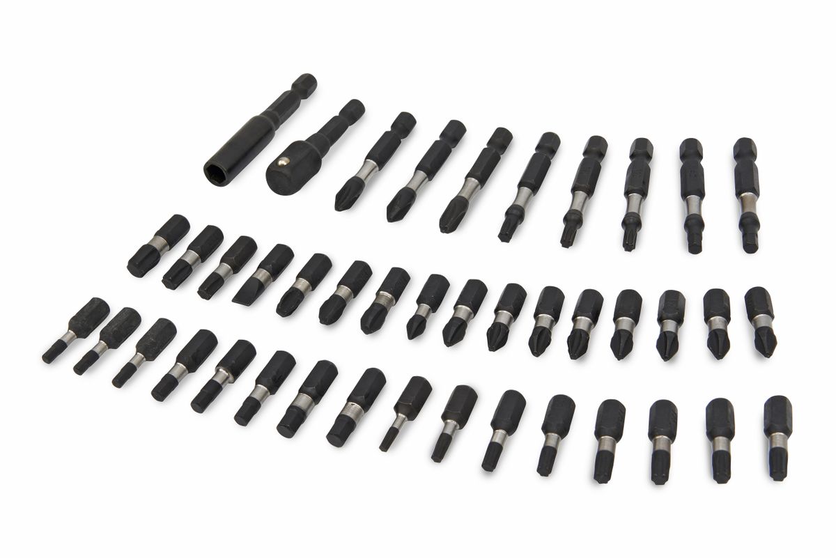 Heeft u wel eens een schroef met een slagmoersleutel of schroefboormachine aangedraaid, waarbij de kop van de schroef op het laatste moment afbrak? Dat wordt veroorzaakt door metaalmoeheid in de schroef ten gevolge van het torsiemoment, gecombineerd met de heftige trillingen / schokken die optreden tijdens het aandraaien. Deze set bits zijn van een speciale legering gemaakt en hebben een speciale warmtebehandeling ondergaan die ervoor zorgt dat de steel van de bits schokabsorberende eigenschappen heeft. Met name de lange versies van de bits absorberen de ergste schokken die aan de schroef worden doorgegeven en die optreden tijdens het aandraaien van een schroef met een slagmoersleutel of een schroefboormachine. Het absorberen van deze schokken vermijd dus het afbreken van de kop van een schroef ten gevolge van metaalmoeheid en verlengd bovendien de levensduur van deze bits. De bitset bestaat uit lange en korte versies van de meest voorkomende maten van torx, hex en phillips bits.