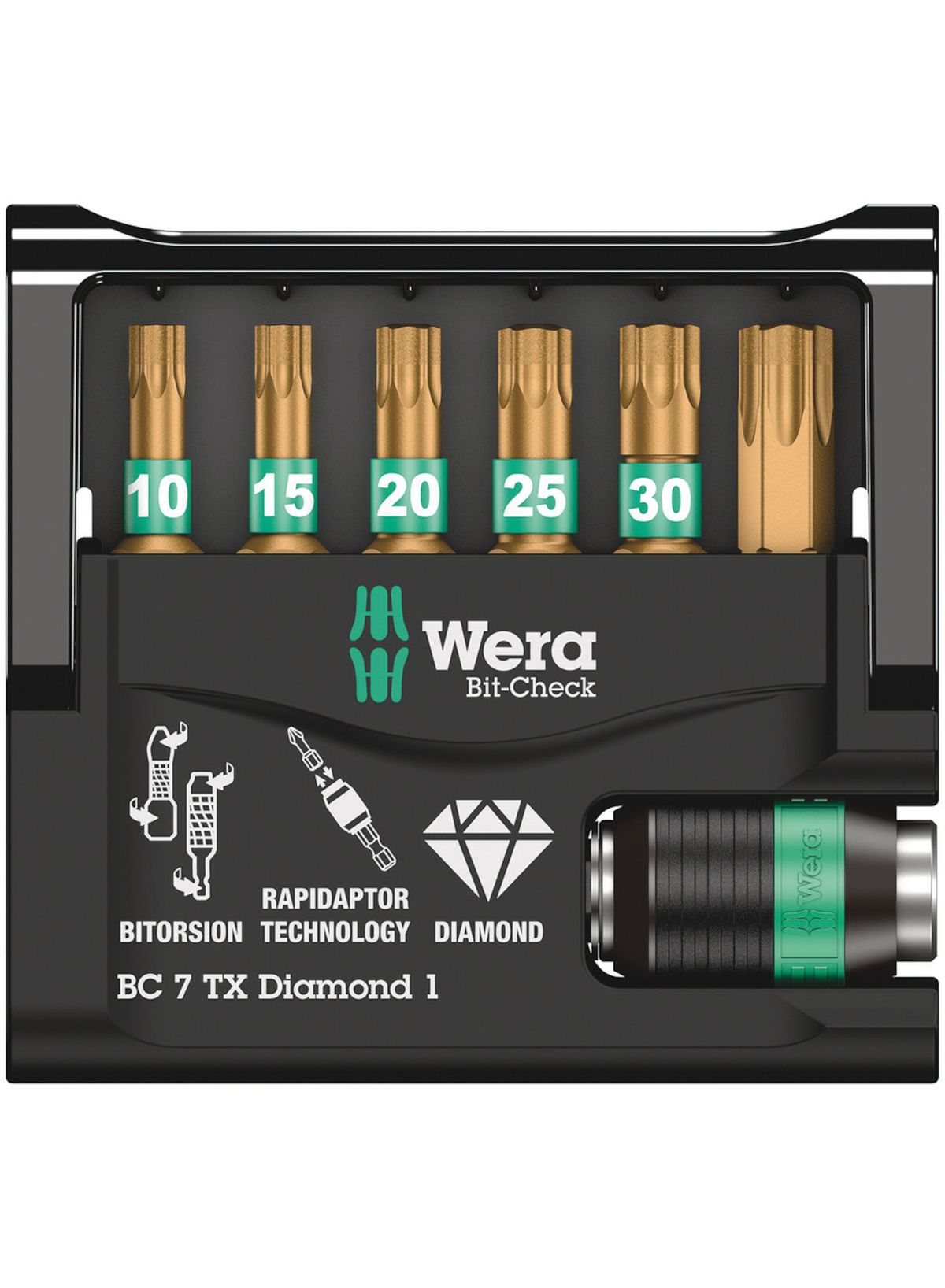 Bits met minuscule diamantdeeltjes op bitpunt. Deze zorgen voor een veilige grip op de schroef, verkleinen de vereiste aandrukkracht en reduceren het risico op wegglijden. BiTorsion-bits met torsiezone, waarin bij belastingspieken kinetische energie wordt afgeleid. Hierdoor wordt de levensduur van het product aanzienlijk hoger. Voorzien van Rapidaptor-technologie, om de bits te kunnen plaatsen zonder daartoe de huls te moeten bedienen. Om de bits weer te verwijderen, hoeft u de huls slechts naar voren te schuiven – zo kunt u bits zelfs met 1 hand razendsnel wisselen. Voor plaatsing in de schroefboormachine of in boorkop van een elektronisch geregelde boormachine. De meerdelige Bit-Check overtuigt door het lage gewicht en uitstekende compactheid. Daarbij zorgt het zachte materiaal in het onderste gedeelte van de Bit-Check voor een betere houvast voor de bits en maakt tegelijk het uitnemen daarvan makkelijker. Het profiel en het formaat van de bits zijn gemakkelijk te herkennen dankzij de Wera ‘Take it easy’-Toolfinder met kleurcodering en duidelijk zichtbare beschrijving.