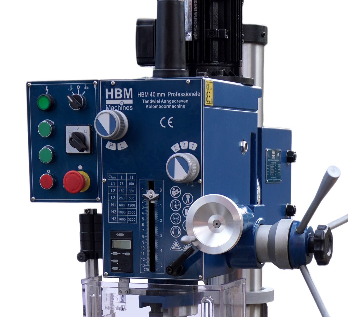 De HBM 40 mm Tandwiel Aangedreven Kolomboormachine is een krachtige kolomboormachine met tandwielaandrijving, uitgevoerd met een MT4 spindelopname. Dankzij deze robuuste opname is de machine geschikt voor zware boortoepassingen tot 40 mm in staal. De spilslag van 115 mm biedt ruim bereik bij diepe boringen, terwijl de ruime afstand van 715 mm tot de werktafel en 1180 mm tot de basis voldoende bewegingsvrijheid geeft voor grote werkstukken. De machine is voorzien van een trapsgewijze snelheidsregeling met 6 standen tot 3200 rpm, aangedreven door een krachtige 1,1 kW motor. De werktafel meet 650 x 450 mm en is uitgerust met sleuven voor veilige klemming van werkstukken. Dankzij de stabiele basis, nauwkeurige instelling en het gebruik van hoogwaardige materialen is deze boormachine bijzonder geschikt voor industriële omgevingen waar betrouwbaarheid, precisie en vermogen essentieel zijn. Ideaal voor zowel enkelstuks als seriewerk.