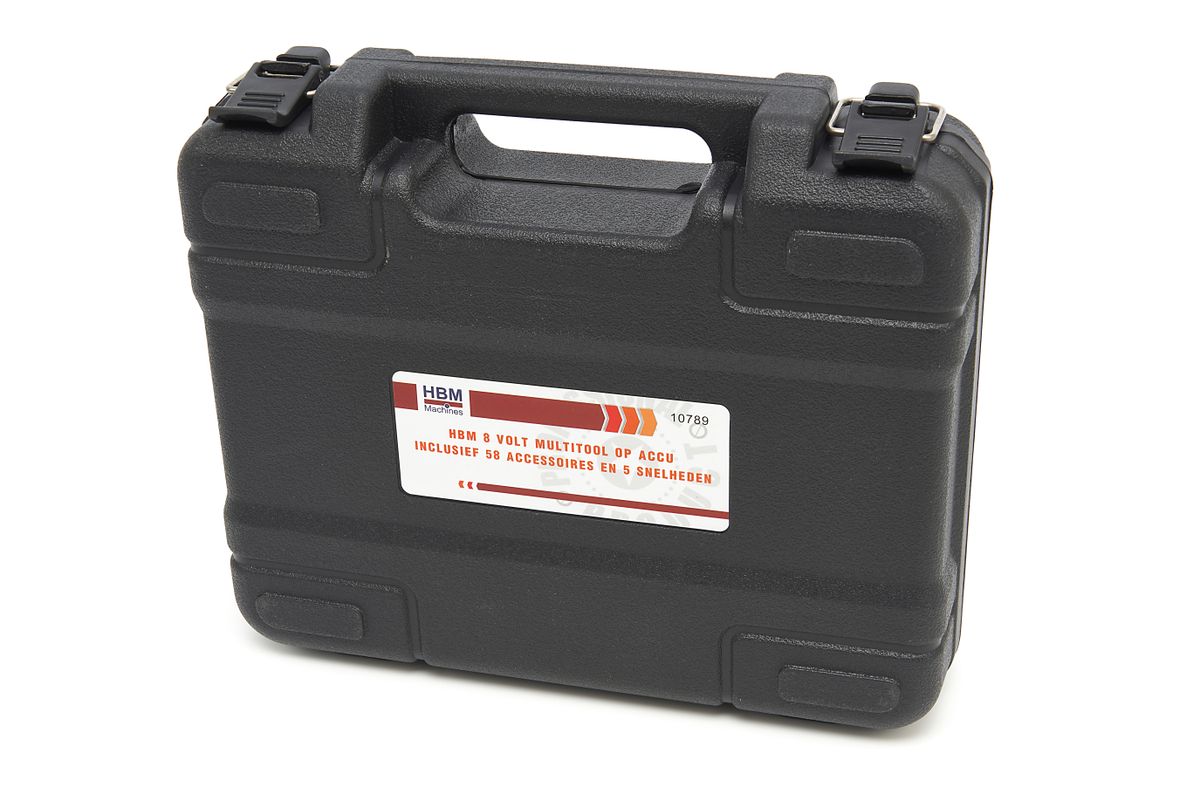 Deze wel zeer compleet uitgevoerde en geleverde multitool, is een krachtige 8 Volt elektrische accu frees-, slijp-, polijst, schuur- en graveermachine, die zeer ergonomisch in de hand ligt. De ingebouwde 8 Volt Li-Ion accu, maakt deze multitool tot een serieus stuk gereedschap. De accu-motor combinatie levert veel koppel, zodat ook werken met tools met grotere diameters langer volgehouden wordt. Het toerental is in 5 stappen regelbaar (middels + en – knoppen) en afleesbaar op een led bar. Een aparte led bar geeft het laadniveau van de accu aan, zowel tijdens gebruik als tijdens het laden.De opname bestaat uit een messingen spantang, waarmee maar liefst 58 verschillende meegeleverde tools kunnen worden ingeklemd op de motoras. Het blokkeren van de uitgaande as voor het bevestigen van een tool geschiedt door een knop in te drukken. Zo kan je dus snel wisselen van tool. De set bevat verder ook een beschermkap om de gebruiker te beschermen tegen vonken (bij het slijpen), spaanders of stof (bij het schuren) of tegen de brokstukken van een kwetsbaar mini-slijpschijfje (die nooit waarschuwen wanneer ze gaan breken en het altijd wel een keer doen). Opladen geschiedt met de meegeleverde lader. Alles zit mooi verpakt in een ruime opbergkoffer, zodat je dit onmisbare stuk gereedschap overal mee naartoe kan nemen.