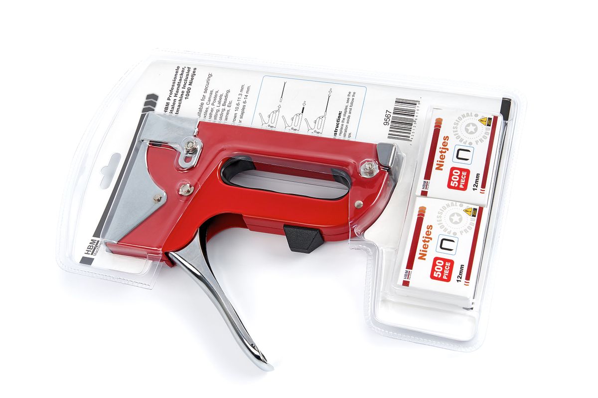 Handtackers zijn de ideale hulpjes voor het huishouden, in de tuin of voor de creatieve hobbywerkplaats. Uitgerust met greepvergrendeling en laadmechanisme aan de achterkant verwerkt de tacker onder andere rond materiaal met een diameter tot maar liefst 14 mm. Een compact stalen nietmachine met sterk veersysteem, een comfortabele vingergrip en een ontnieter. Voor vele toepassingen is deze handslagtacker een uitstekende oplossing. Wilt u dakfolie op hout vastnieten of meubels stofferen? Of wilt u een dak isoleren waarbij geen elektriciteit of gebruik van compressor mogelijk is, dan is een handtacker de beste oplossing. Met een handtacker kunt u gemakkelijk ter plaatse het materiaal vast nieten zonder hiervoor een compressor of elektriciteit nodig te hebben. Het vergt misschien wel meer kracht en arbeid om te nieten met een handslagtacker, maar deze manier van bevestigen brengt wel grote voordelen met zich mee. Bent u zelf handig en wilt u bijvoorbeeld een stoel opnieuw gaan stofferen. Dan kunt u veel tijd en inspanning besparen door met een handtacker te gaan werken. Als u een leuk stoeltje heeft dat altijd bij opa en oma stond en dat u laatst gekregen heeft en wil opvrolijken met een nieuw stofje. Het is een leuk stoeltje maar misschien wel heel erg versleten. U kunt het natuurlijk ook naar een stoffeerder brengen en het laten herstofferen. Maar dat is erg kostbaar. Waarom gaat u de uitdaging niet eens aan om het zelf te stofferen? Kortom, bevestig de dingen die niet met een normale nietmachine vastgezet kunnen worden met deze robuuste tacker. Bij het doe-het-zelven, in een werkplaats en zelfs in het huishouden kunt u niet zonder deze sterke professionele tacker met een duurzame, bijzonder terugslag arme behuizing.