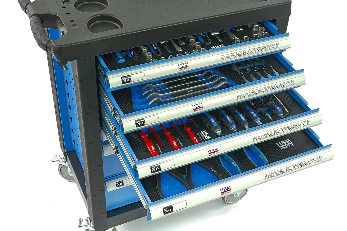 Elke zzpér, of doe-het-zelver heeft behoefte aan een overzichtelijke opslagplaats voor tools, zoals schroevendraaiers, T-verbindingsstukken, tangen en meer. Met de blauwe 154-delige gevulde gereedschapswagen van HBM geniet je van een efficiënte en betrouwbare opbergruimte voor al je gereedschap. Dankzij het relatief gewicht en een stevige handgreep verplaats je al dit gereedschap ook eenvoudig. De lades zijn afzonderlijk afsluitbaar door middel van en quick-lock sluiting. Dankzij de blauwe poedercoat afwerking oogt deze gereedschapswagen strak én professioneel. Door middel van twee normale wielen en twee zwenkwielen (waarvan er een met een rem is uitgerust) gaat de verplaatsing van de wagen in de werkplaats of naar een klus een stuk gemakkelijker. Een bovenplaat met duidelijke vakverdeling geeft je de mogelijkheid om tools ook bovenaan overzichtelijk op te bergen en kleine klusjes ter plekke uit te voeren.