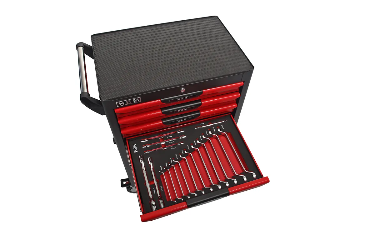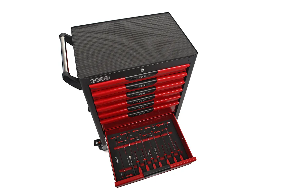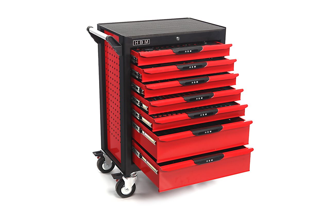 De HBM Premium Gevulde gereedschapswagen – 283 Delig biedt een doordachte en overzichtelijke oplossing voor het opbergen van gereedschap. Dankzij de reeds gevulde lades en de slimme indeling werk je sneller, netter en efficiënter. De poedercoating beschermt tegen slijtage en geeft de wagen een strakke uitstraling. Elke lade is voorzien van antislipmatten en varieert in afmeting, zodat je flexibel blijft in je inrichting. De dikke rubberen topmat en opstaande rand bieden ruimte voor kleine werkzaamheden aan de bovenkant van de wagen. Een functioneel en duurzaam element in iedere werkplaats.